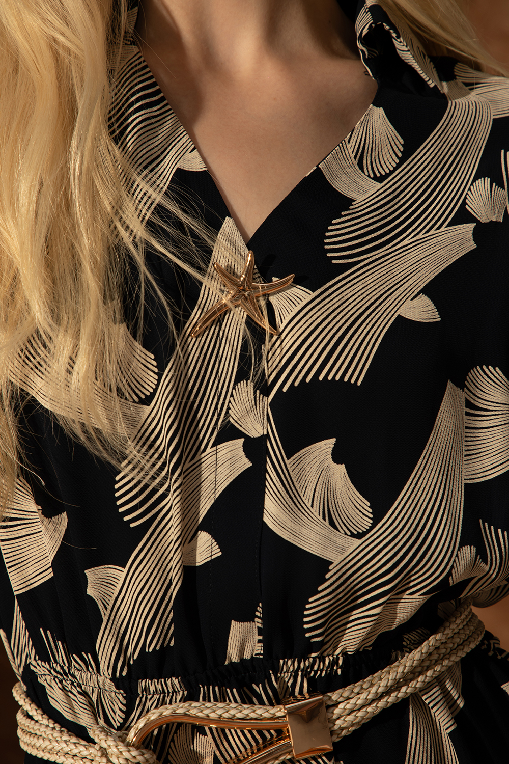 Спортно-елегантна рокля от лека и приятна материя в тъмно синьо с ефектен авторски принт. Леко свободен модел с фиксиран ластик в талията. Стилно V-образно деколте с яка и ефектно бижу. Два вътрешни странични джоба.