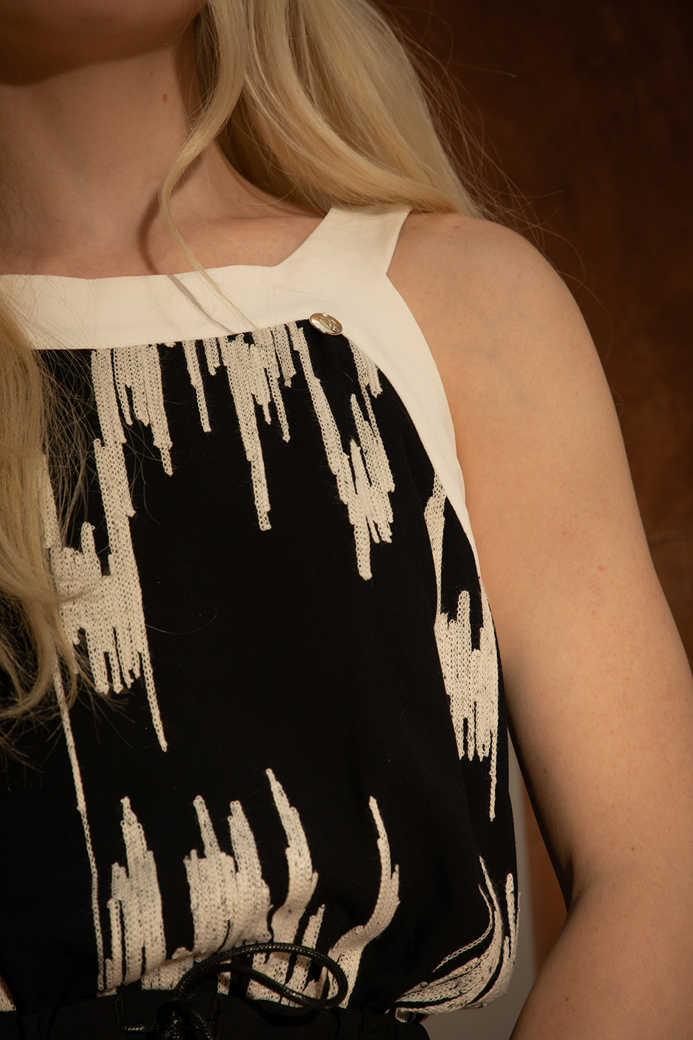 Елегантна рокля от приятна материя с високо съдържание на памук в черно с бродирани детайли в бяло. Леко свободен силует с връзка в талията за допълнително вталяване. Обло деколте и миди дължина.