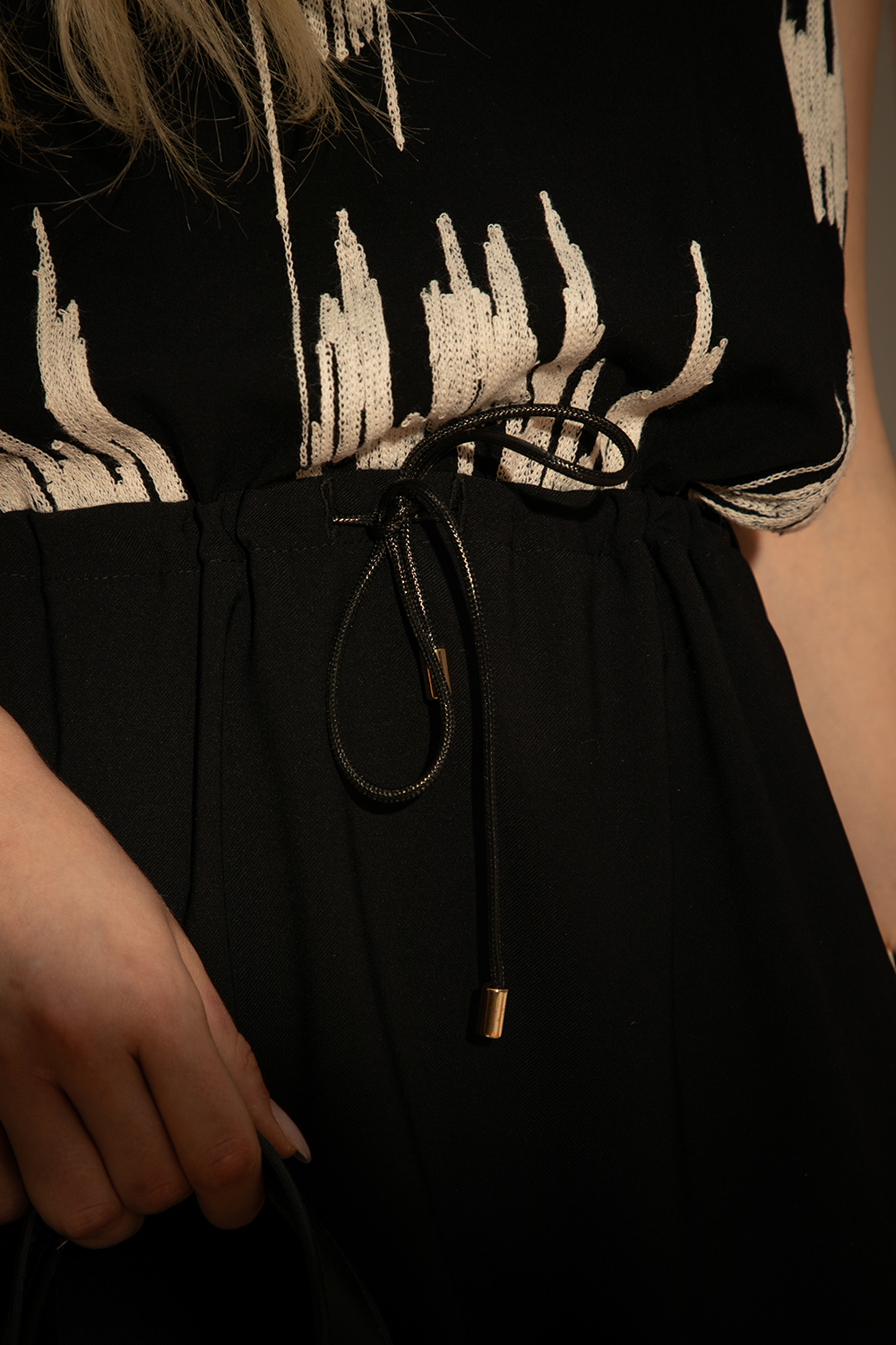 Елегантна рокля от приятна материя с високо съдържание на памук в черно с бродирани детайли в бяло. Леко свободен силует с връзка в талията за допълнително вталяване. Обло деколте и миди дължина.