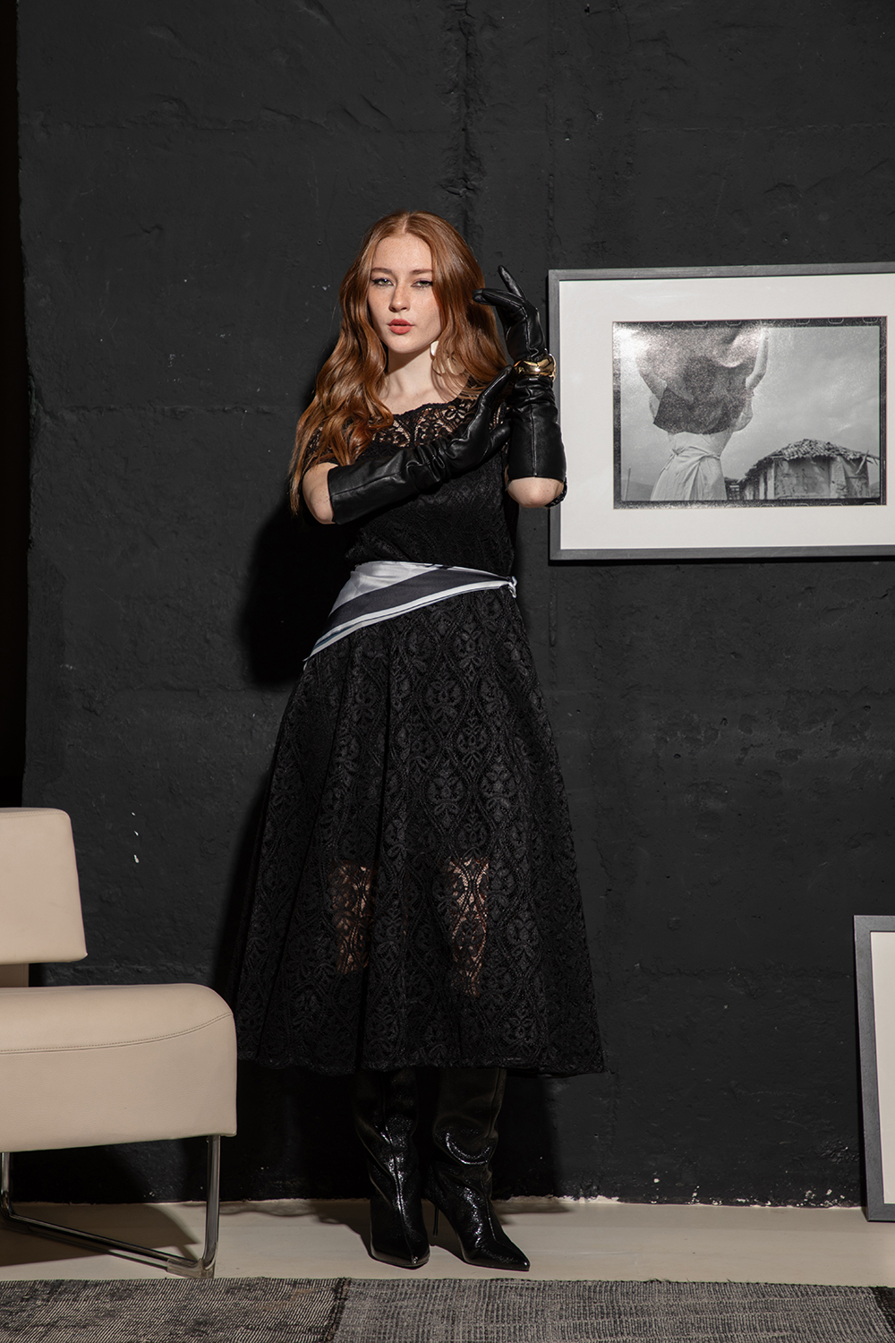 Елегантна и изчистена рокля от черна дантела. Втален силует с разкроена долна част. Обло деколте и къс ръкав. Закопчаване посредством скрит цип на гърба. Роклята се предлага с отделна еластична подплата тип рокля с презрамки.