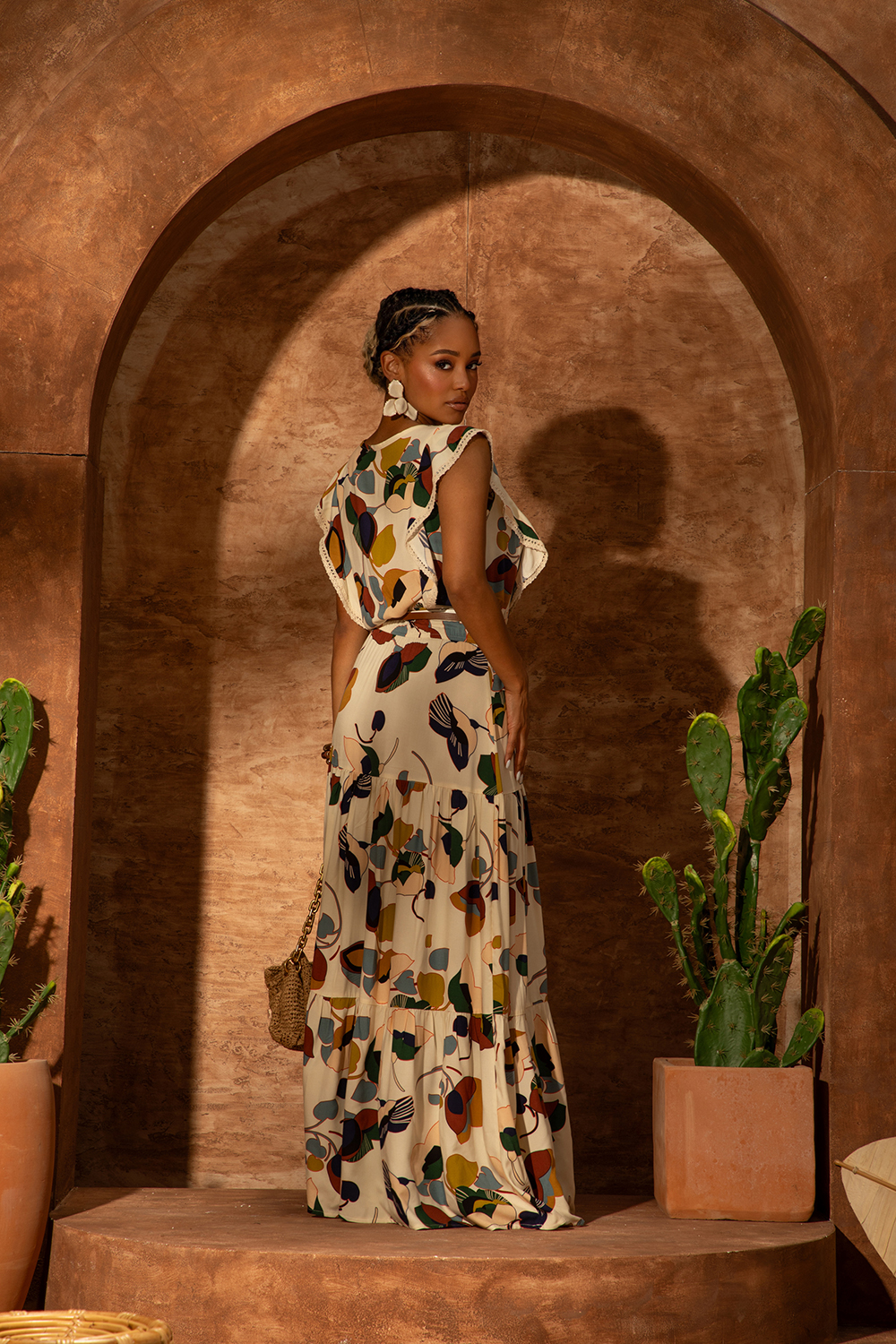 Красива дълга рокля от нежна материя смес от памук и вискоза в свежи цветове. Леко свободна линия вталена посредством ластик и V-образно деколте. Разкошни къдри в предната част и богати волани в долната.