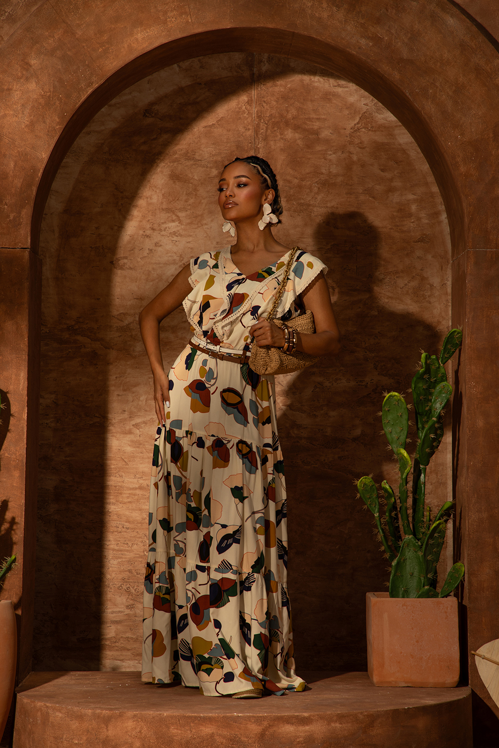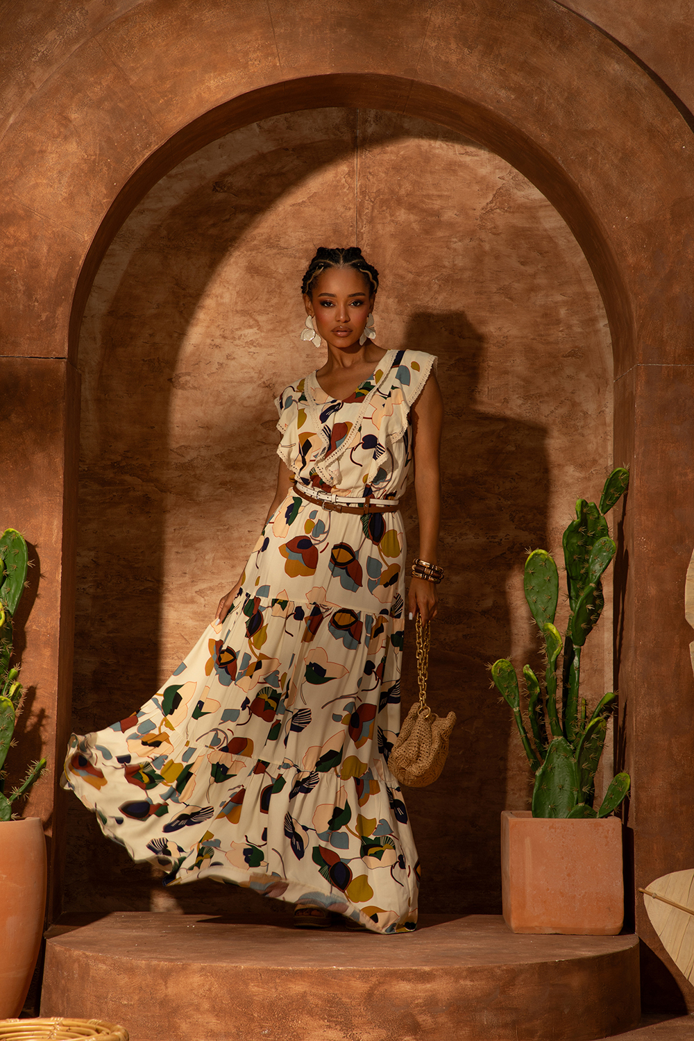 Красива дълга рокля от нежна материя смес от памук и вискоза в свежи цветове. Леко свободна линия вталена посредством ластик и V-образно деколте. Разкошни къдри в предната част и богати волани в долната.