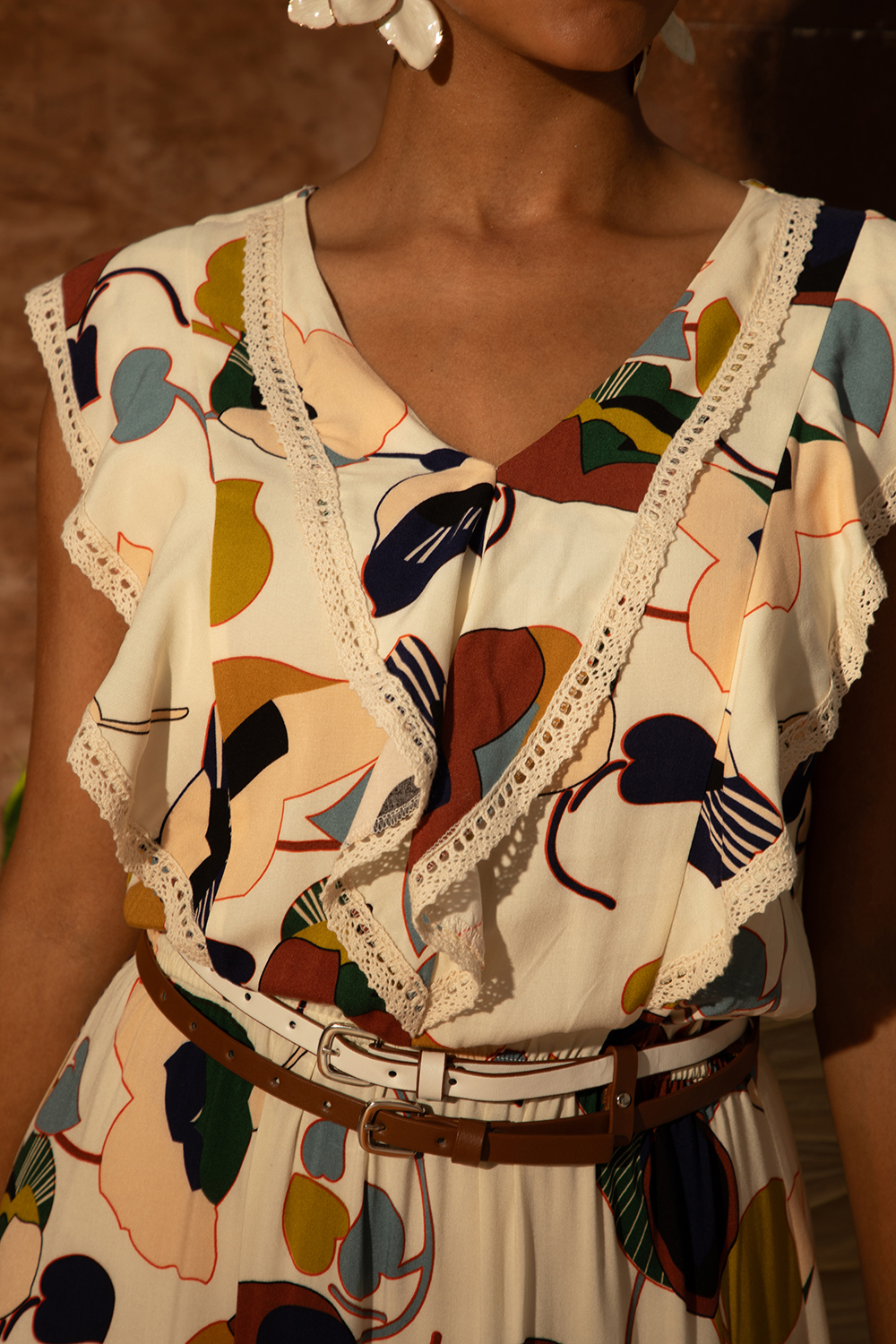 Красива дълга рокля от нежна материя смес от памук и вискоза в свежи цветове. Леко свободна линия вталена посредством ластик и V-образно деколте. Разкошни къдри в предната част и богати волани в долната.
