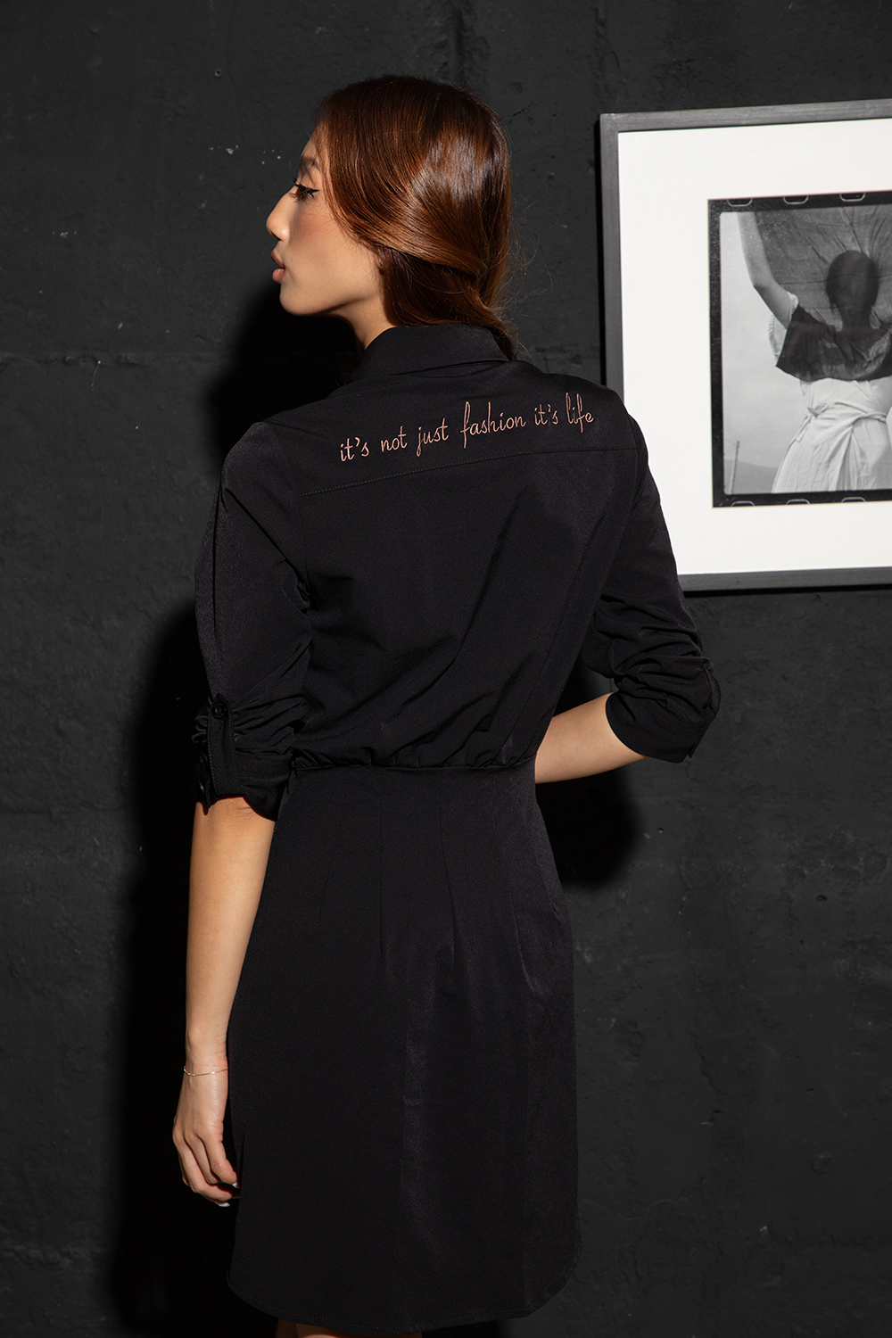 Спортно-елегантна рокля от приятна силно еластична материя в черно. Втален силует тип риза с предно закопчаване посредством пластрон с копчета и яка. 7/8 ръкав с маншет и щрифелка. Ефектна бродерия на гърба и лек ластик в задната част талията, както и два странични джоба.
