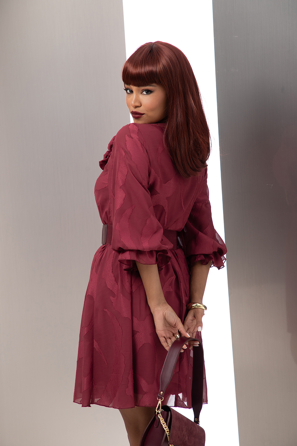 Елегантна рокля от ефектен шифон в бордо. Леко свободна кройка вталена посредством ластк в кръста. Стилно V-образно деколте с ефектни рози на едната предница. Разкошен 7/8 ръкав с къдра и богат волан в долната част. Роклята е изработена с лека подплата.