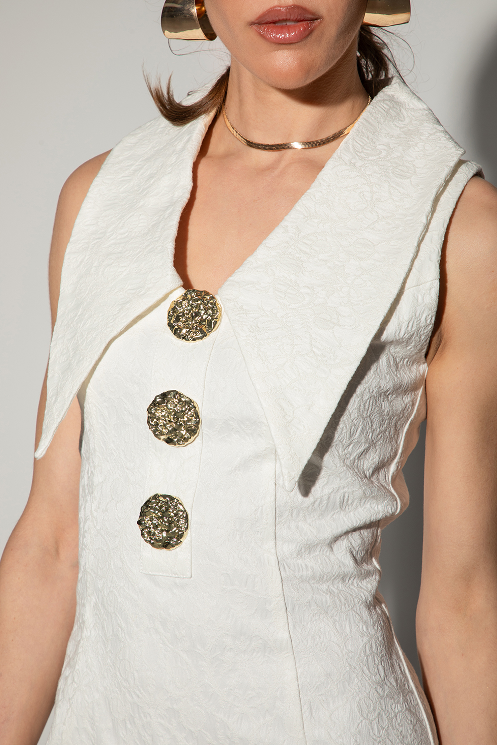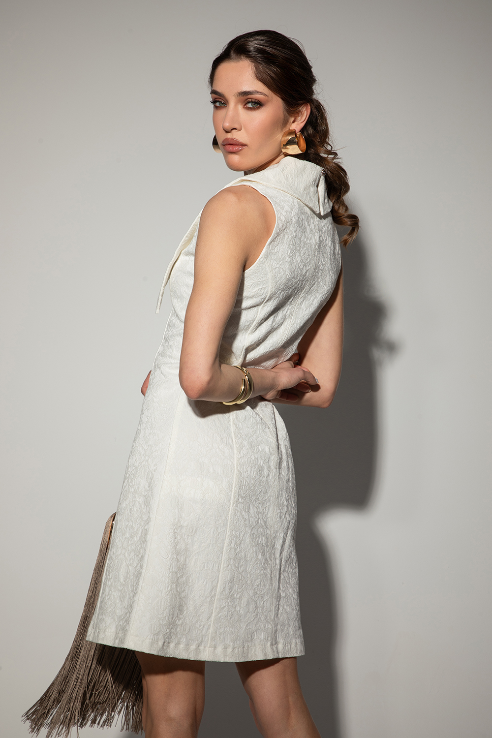 Елегантна рокля в естествено бяло от релефна жакардова материя с еластан. Втален А-силует с V-образно деколте и ефектна голяма яка. Декоративни ефектни копчета в предната част. Закопчаване на гърба посредством скрит цип и копче.
