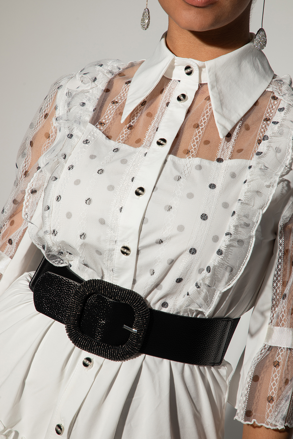Кокетна рокля с ефектна горна част комбинация от тюл на точки и приятна еластична материя в бяло. Предно закопчаване с пластрон и копчета, както и шикозна яка. Нежни къдри и подплата на предницата и 7/8 ръкав от тюл, завършен с къдра. Вталяване посредством ластик и разкроена долна част с волан.