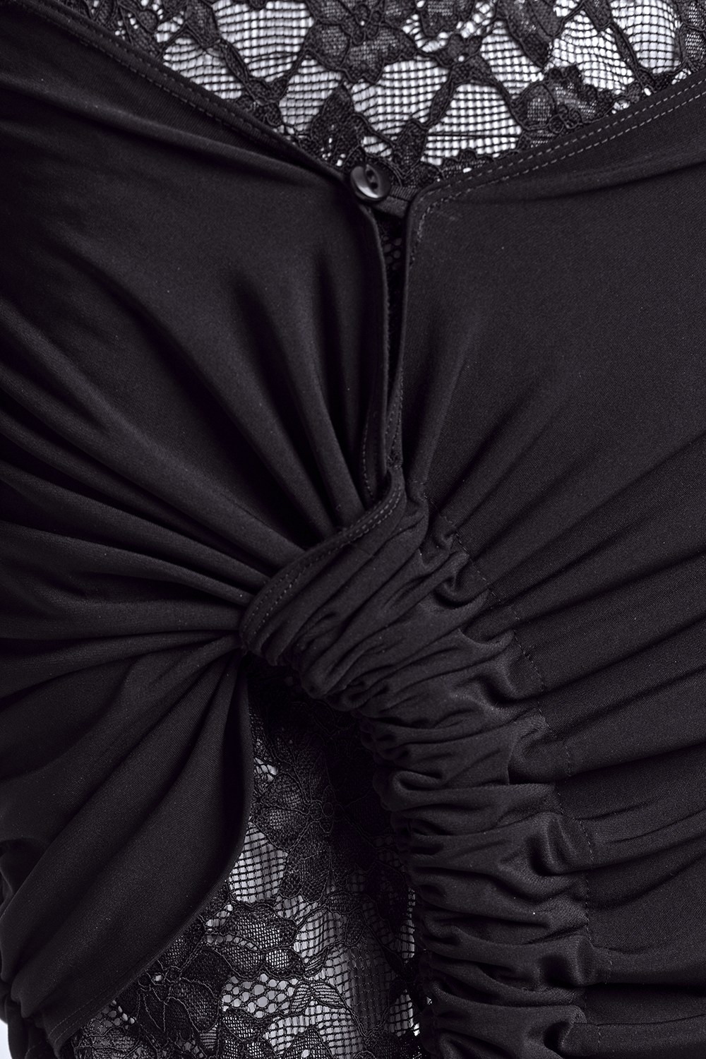 Елегантна къса рокля от красива еластична дантела. Силно втален силует с полу поло и копче на гърба, дълъг свободен ръкав. В горната част има пандела от непрозрачна материя в черно. А надоло е с допълнителна част като пола с асиметрична кройка върху дантелата.