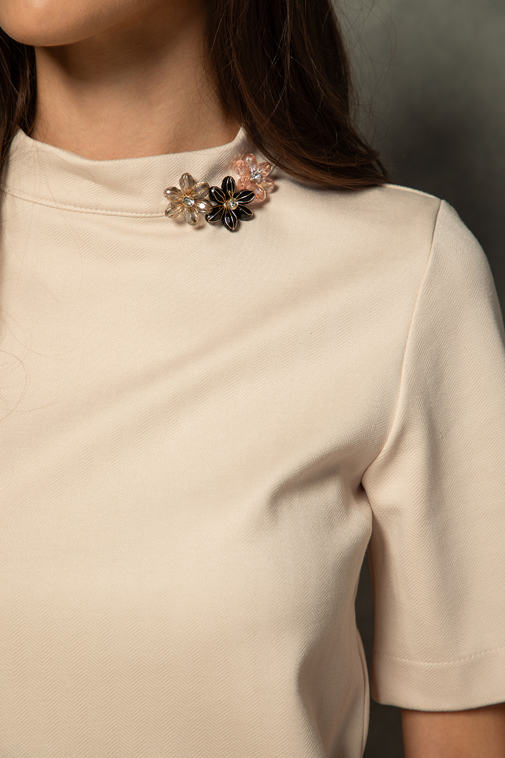 Елегантна рокля от приятна еластична материя със съдържание на памук в светло екрю. Леко втален А-силует с 3/4 ръкав и полу поло яка. Нежна декорация от кристални цветенца.