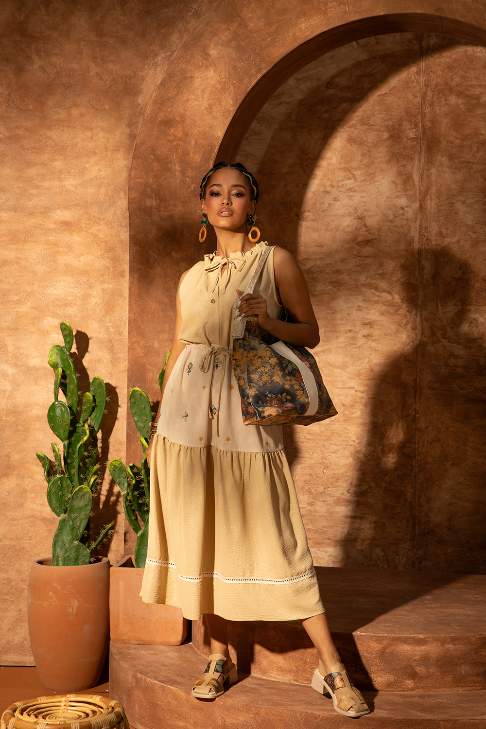 Лека ежедневна рокля от приятна еластична материя в пясъчен цвят с дискретен блясък. Свободен силует с тунел връзка в талията за допълнително вталяване. Разкошни волани и обло деколте с цепка и връзка.