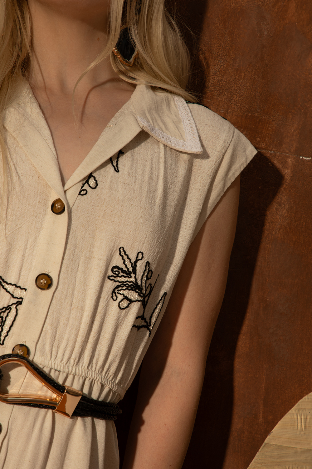 Свежа рокля от лека материя със съдържание на памук и лен в натурално екрю с бродирани детайли в черно. Леко вталена линия с фиксиран ластик в талията и богато разкрояване с волани. Предно закопчаване посредством копчета и яка.