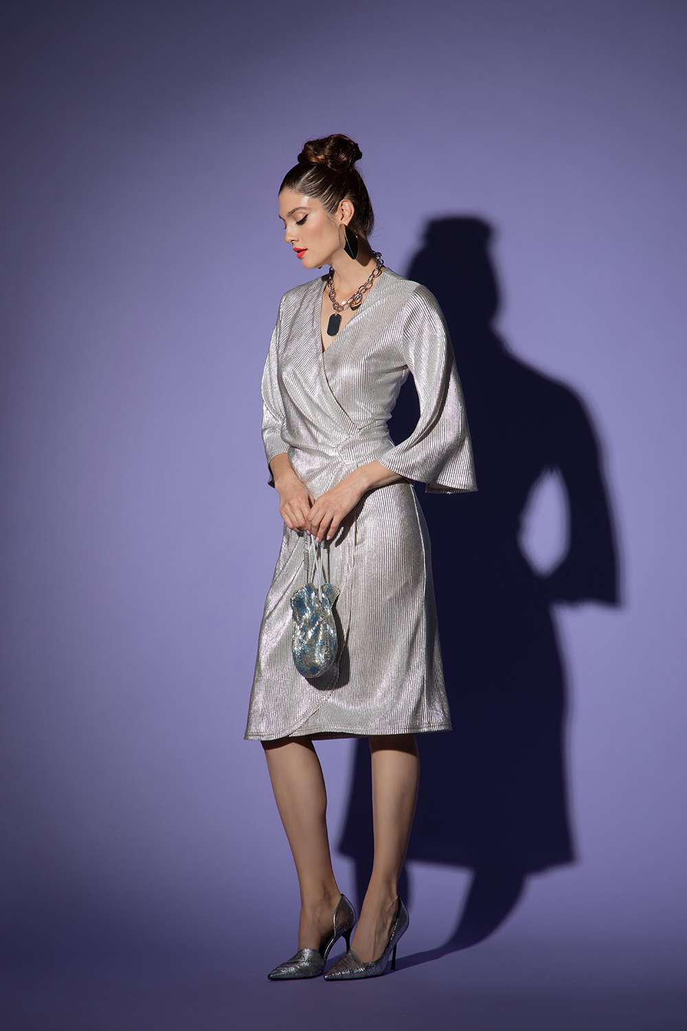 Елегантна рокля от ефектна сребриста материя-солей. Леко втален силует с асиметрично прехвърляне в предната част. Стилно V-образно деколте и 7/8 разкроен ръкав с цепка. Роклята е изработена с лека еластична подплата.