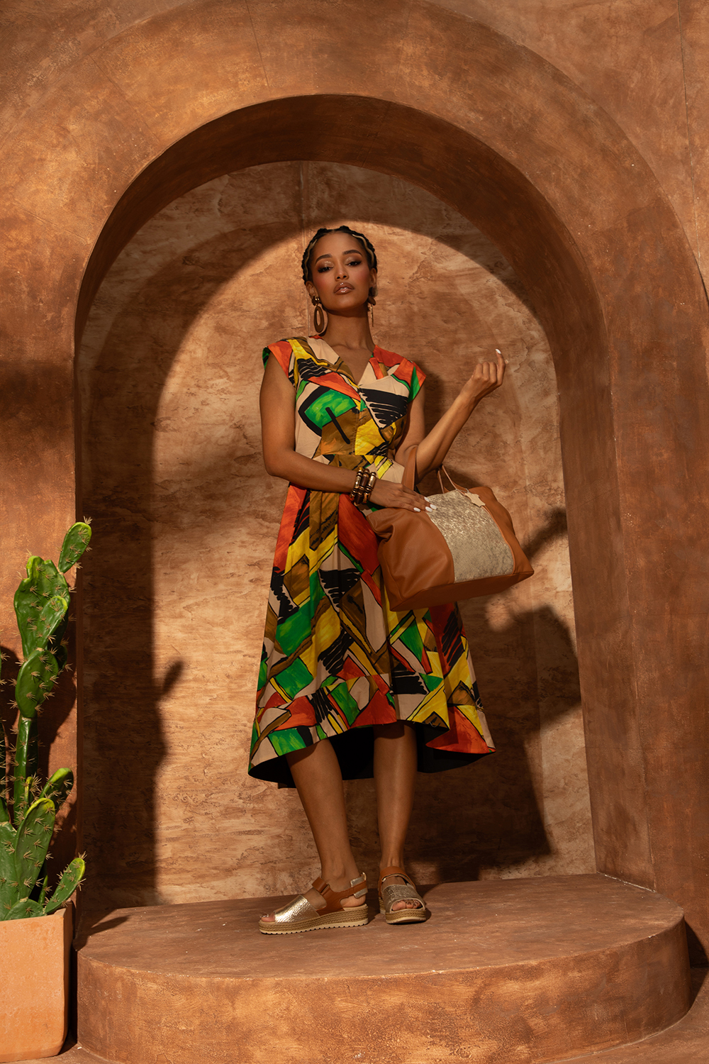 Свежа рокля от лек памук в красиви летни цветове. Леко вталена линия с ластик в задната част на талията и странични джобове. Елегантно V-образно деколте и полу късо ръкавче. Разкошно разкроена долна част с асиметричен заоблен подгъв, по-дълъг в задната част.