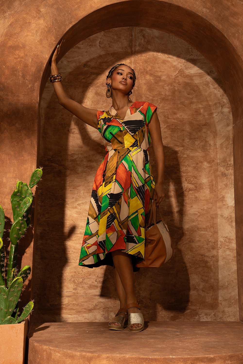 Свежа рокля от лек памук в красиви летни цветове. Леко вталена линия с ластик в задната част на талията и странични джобове. Елегантно V-образно деколте и полу късо ръкавче. Разкошно разкроена долна част с асиметричен заоблен подгъв, по-дълъг в задната част.