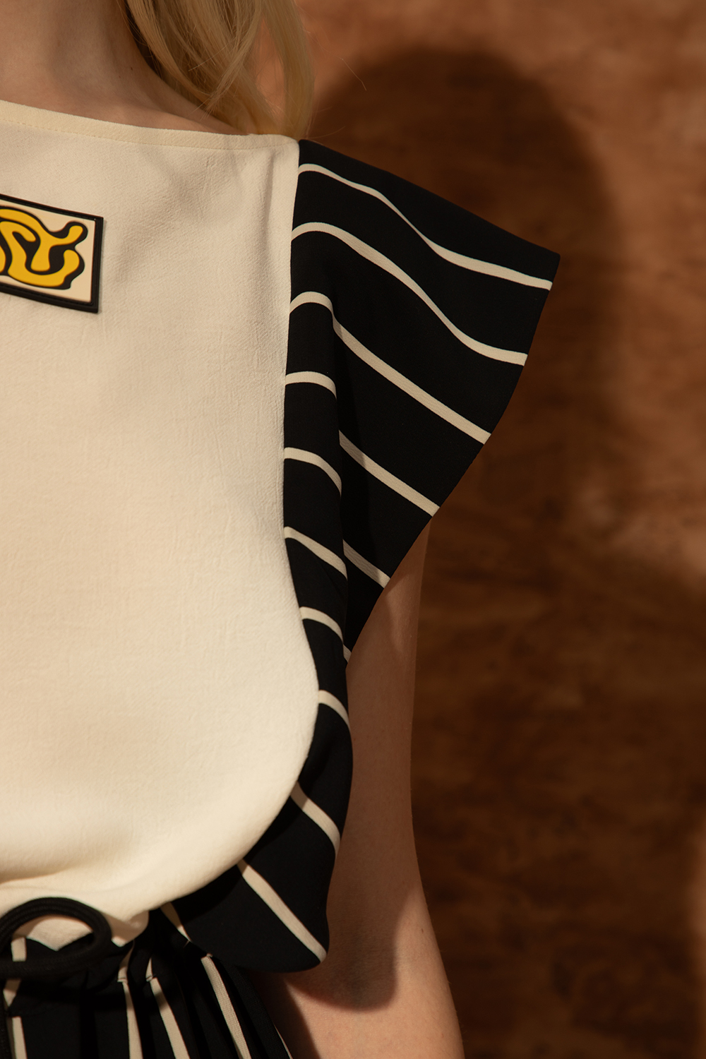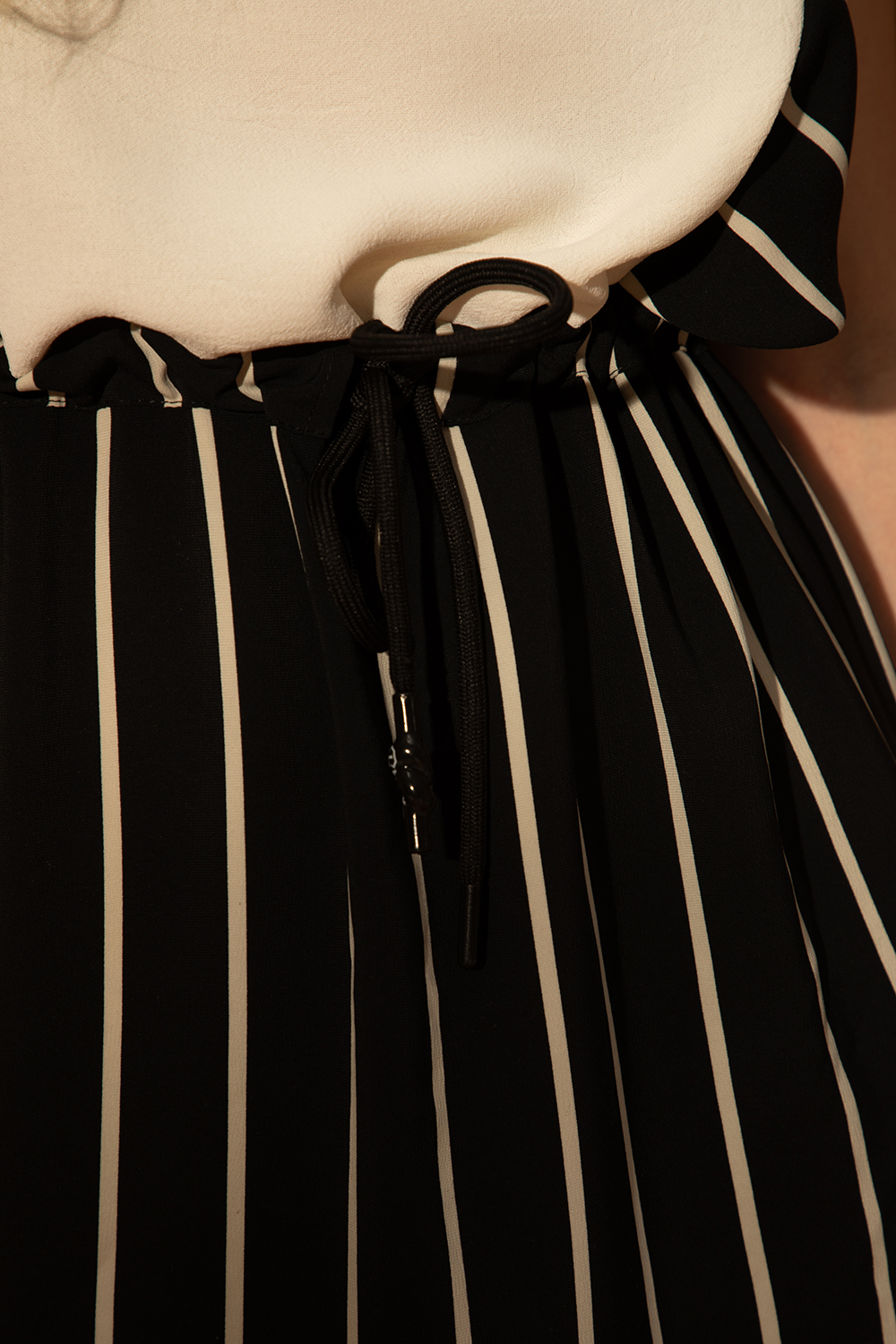 Интересна рокля в черно-бяло от лека материя с високо съдържание на вискоза. Леко свободен силует с вталяване посредством тунел с връзка и лодка деколте.