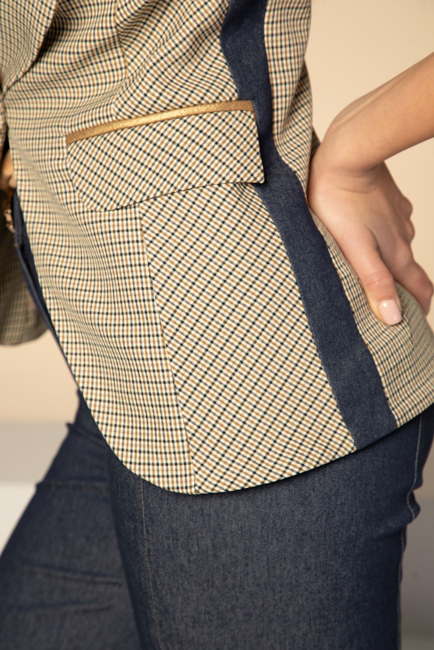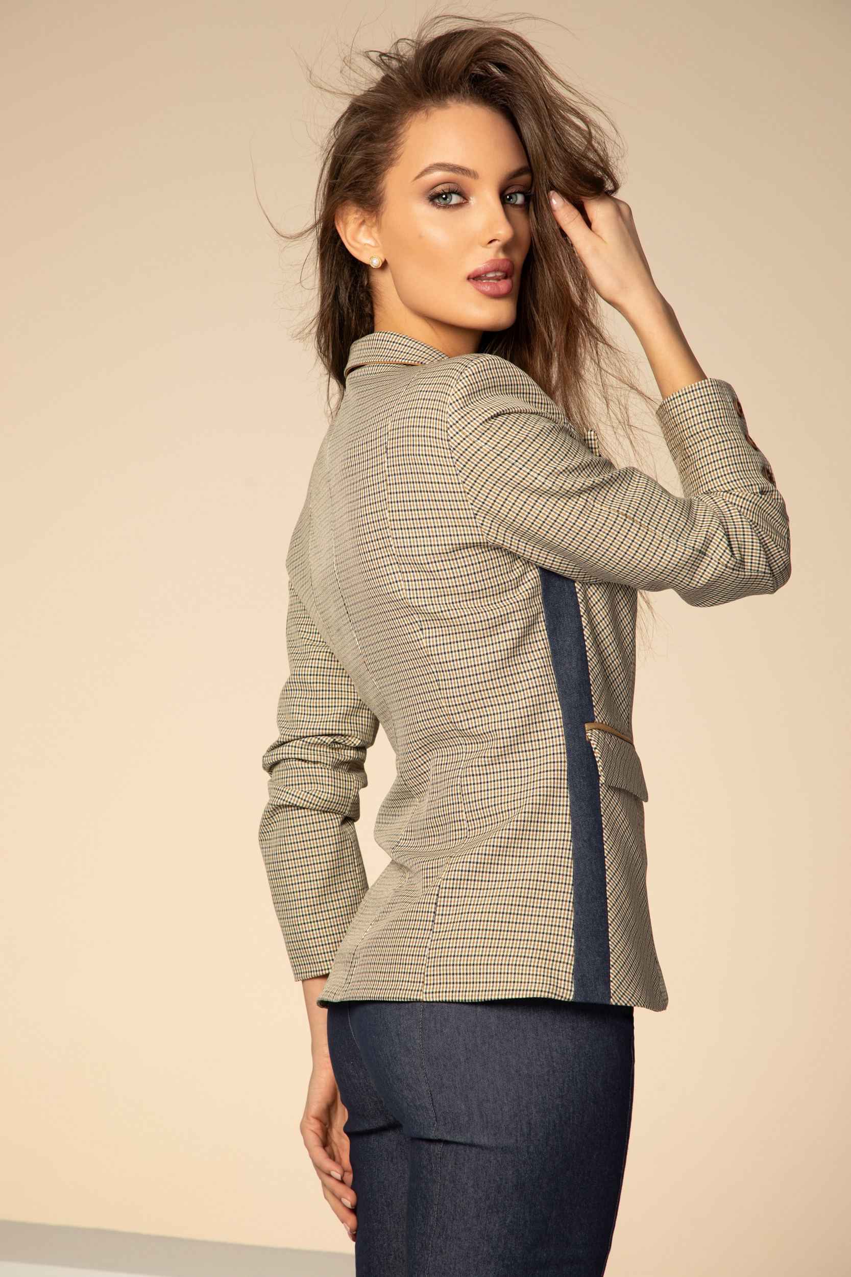Спортно-елегантно сако в ефектно каре с тъмносини и златисти детайли, изработено от приятна еластична материя с високо съдържание на памук. Втален силует с асиметрично закопчаване с едно копче. Ефектен ревер и дълъг ръкав, предни джобове с капаци. Сакото е частично подплатено в предната част.