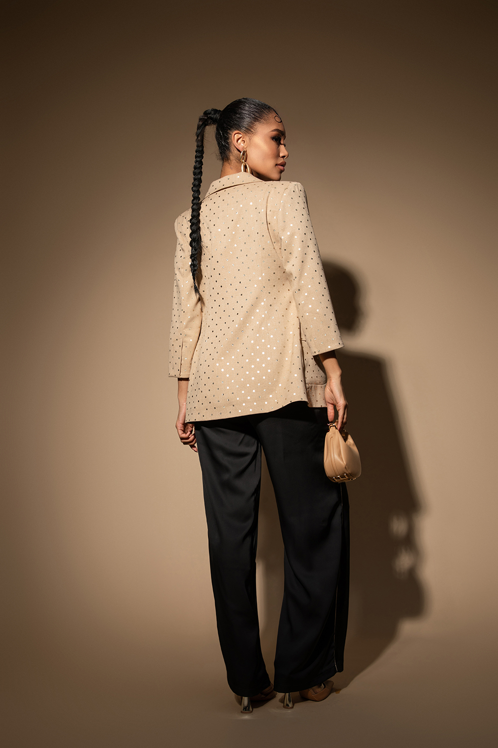 Елегантно сако от фина материя, смес от вискоза и лен в бежово с ефектни златисти точки. Стилна леко вталена линия с издължен силует. Ревер и предно закопчаване посредством златисти копчета. Джобове с капачета на предницата. Сакото е изцяло подплатено с нежна материя.