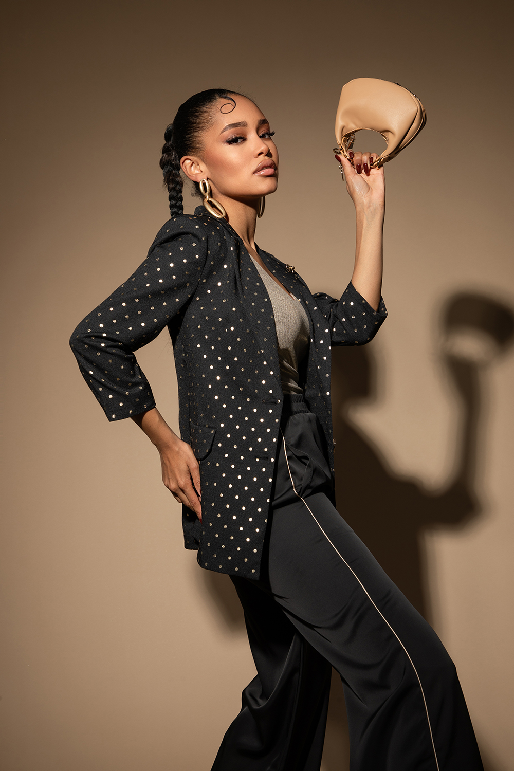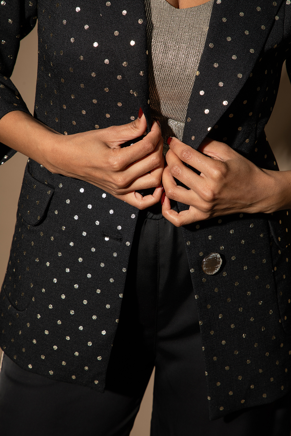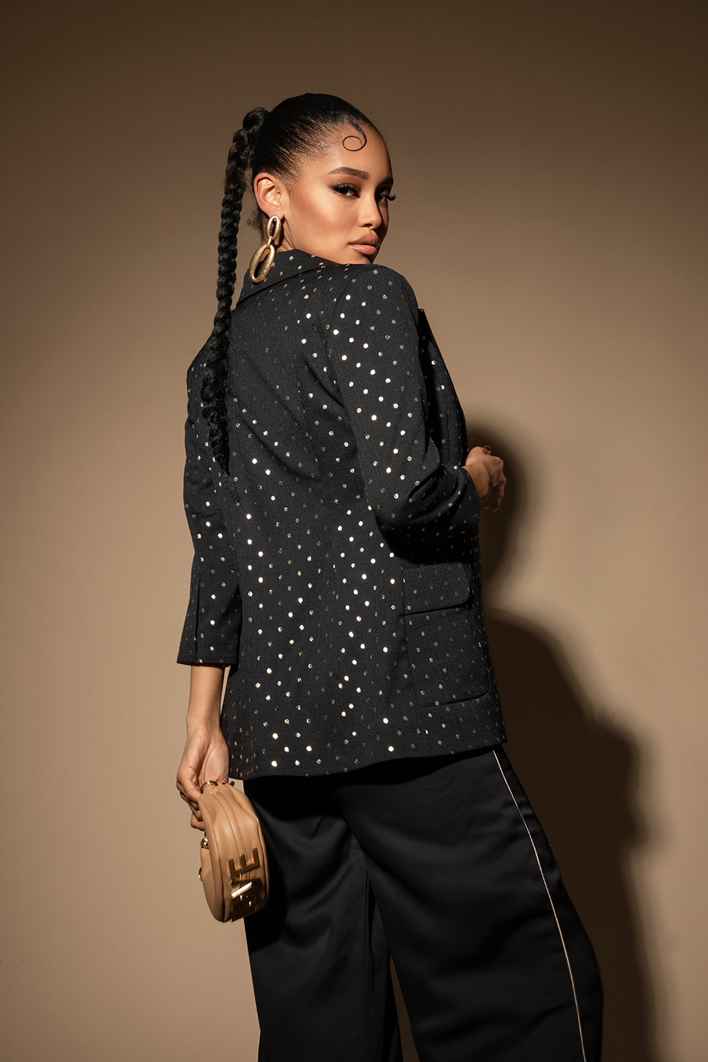 Елегантно сако от фина материя, смес от вискоза и лен в черно с ефектни златисти точки. Стилна леко вталена линия с издължен силует. Ревер и предно закопчаване посредством златисти копчета. Джобове с капачета на предницата. Сакото е изцяло подплатено с нежна материя.