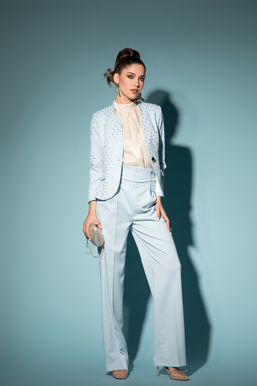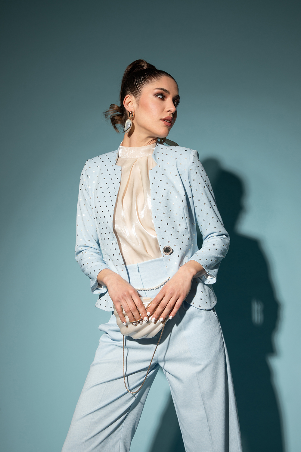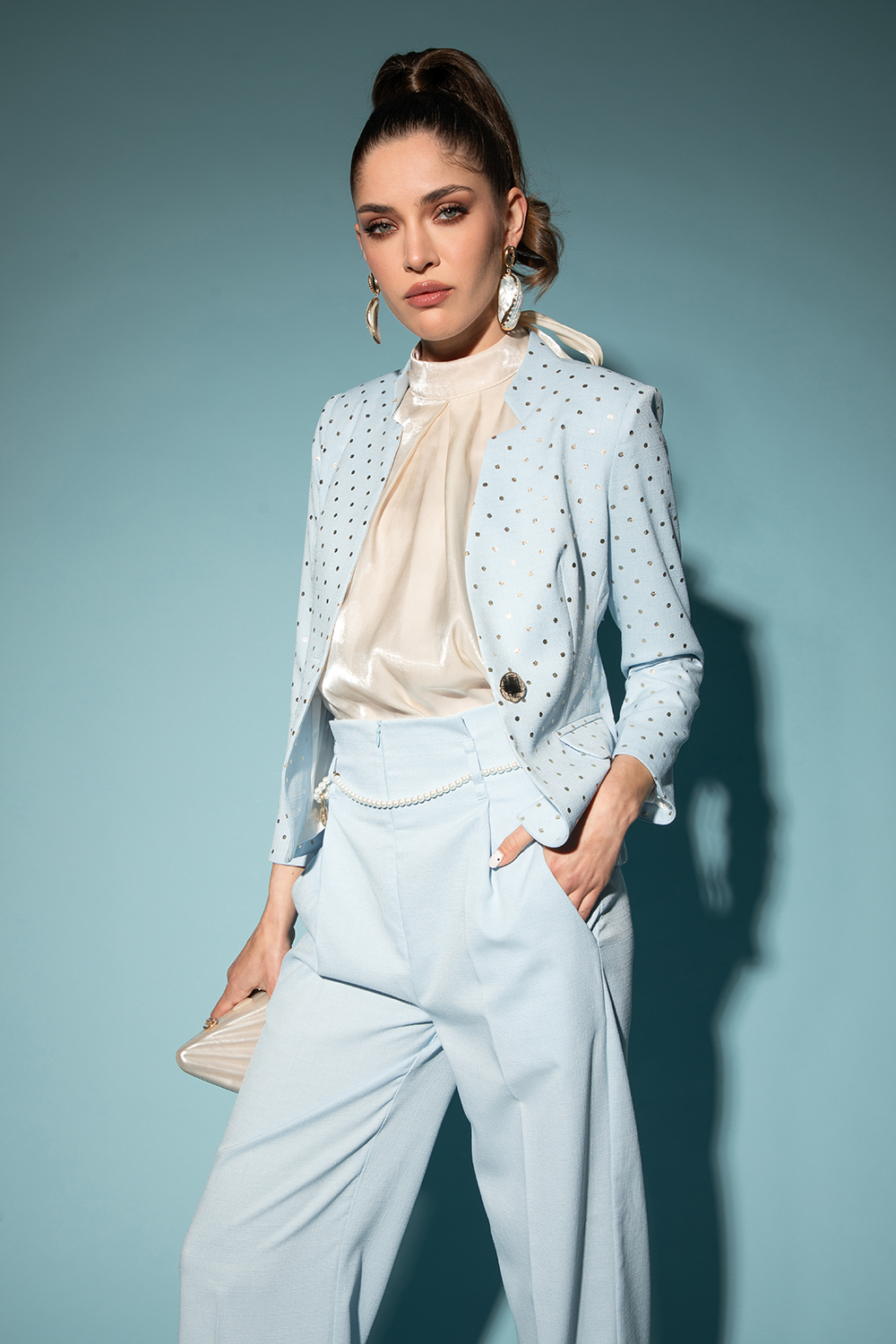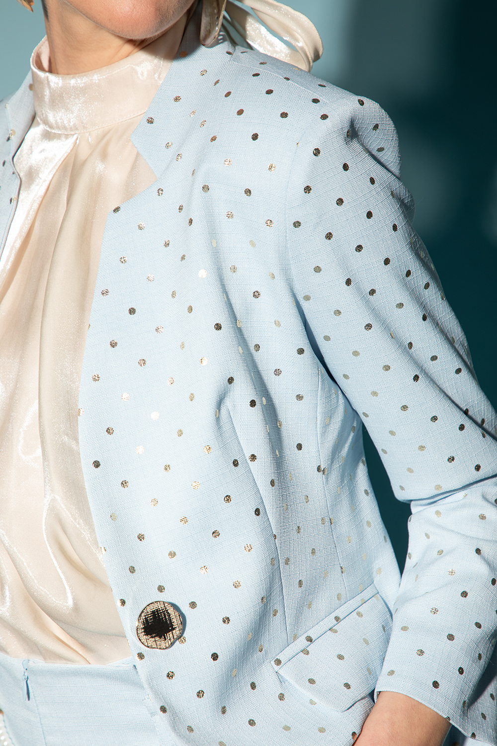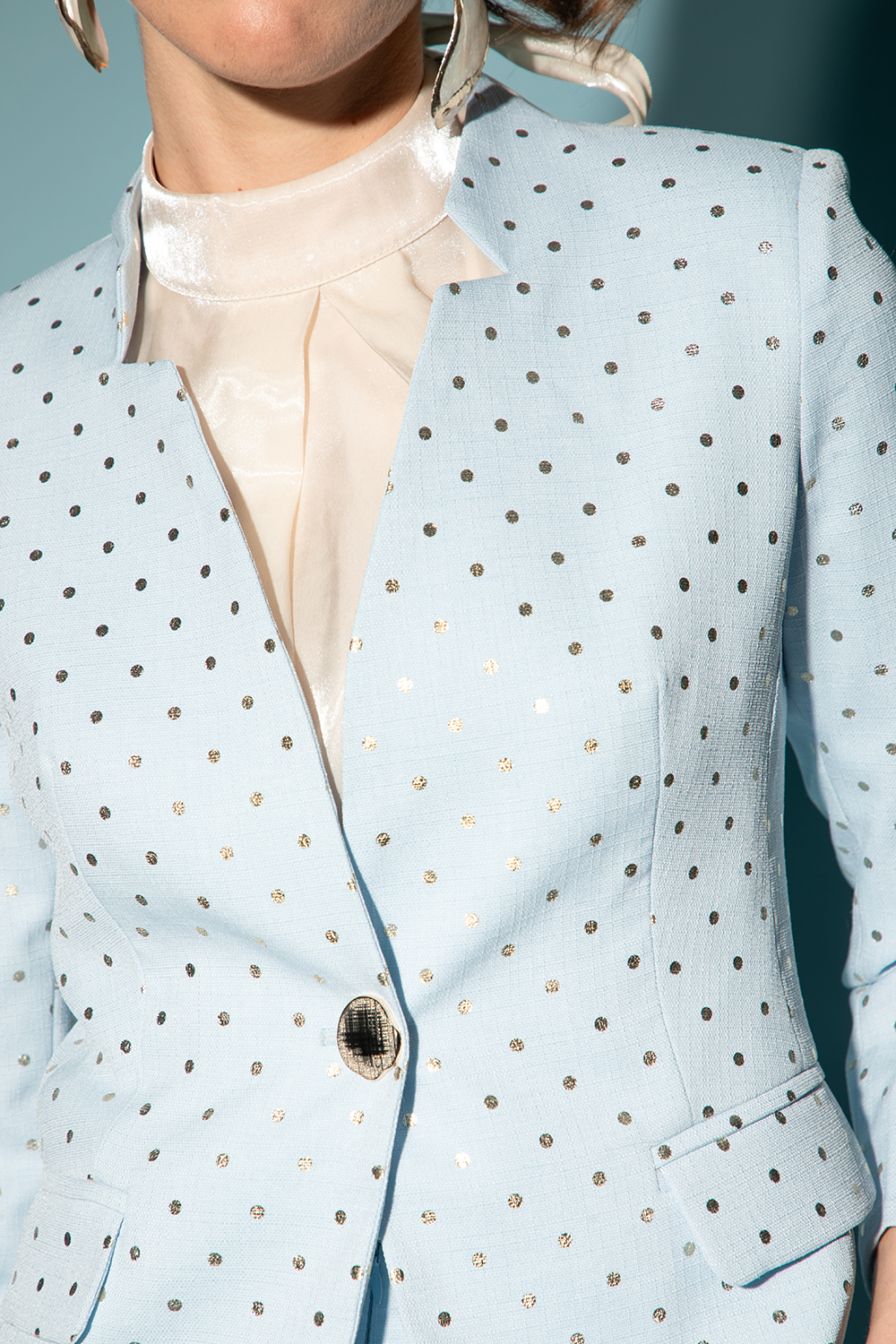 Елегантно сако в светло синьо с дребни златисти точки, изработено от приятна еластична материя смес от лен и вискоза. Изцяло подплатено. Класическа вталена линия, закопчаване посредством едно копче отпред. Изчистена визия без ревер, джобчета с капаци на предницата.