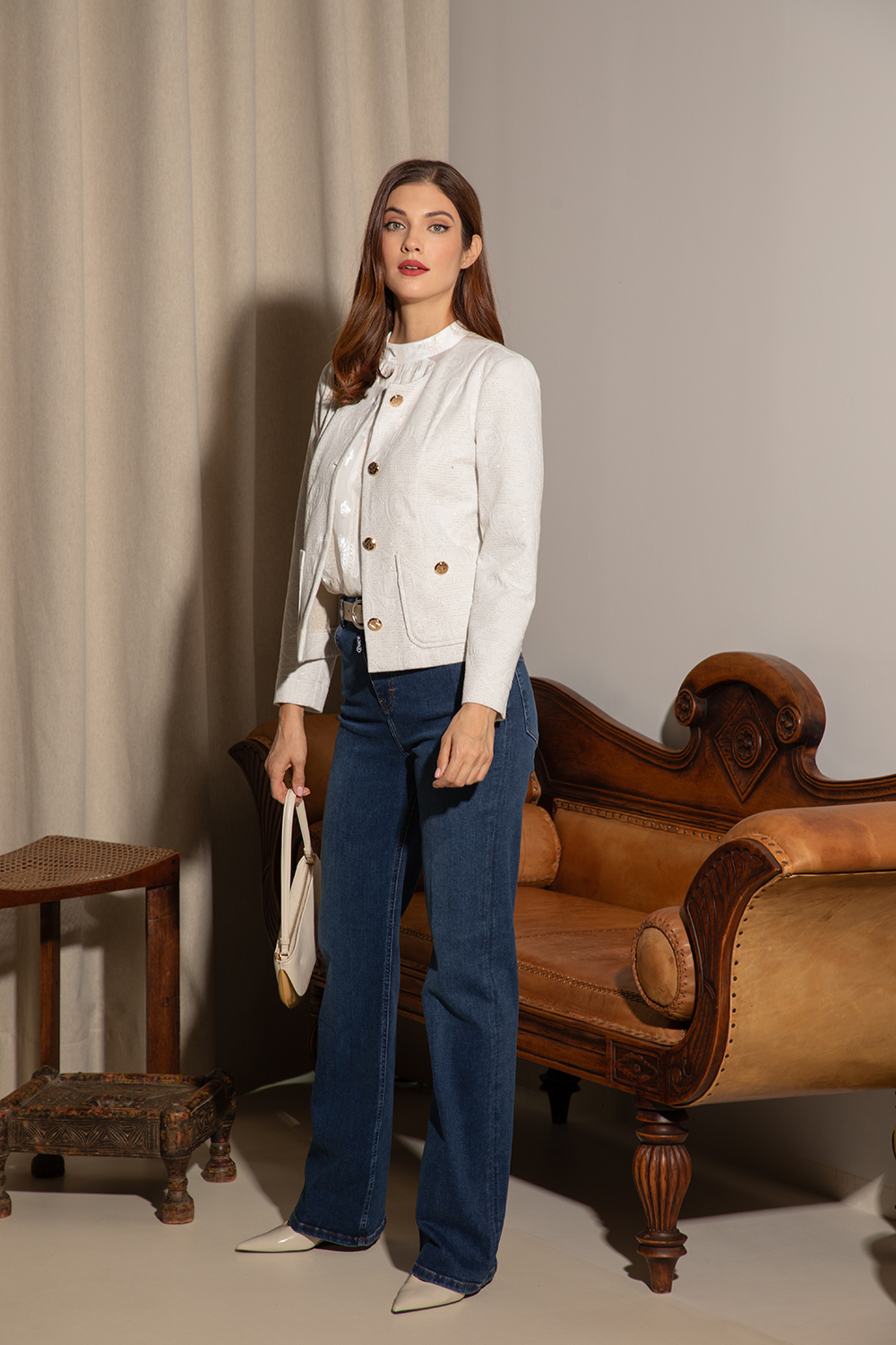 Елегантно сако от ефектна жакардова материя в светло шампанско с дискретен блясък. Стилна изчистена линия с втален силует. Предно закопчаване посредством копчета. Обло деколте и дълъг ръкав външни джобчета с декоративни копчета. Моделът е изработен без подплата.