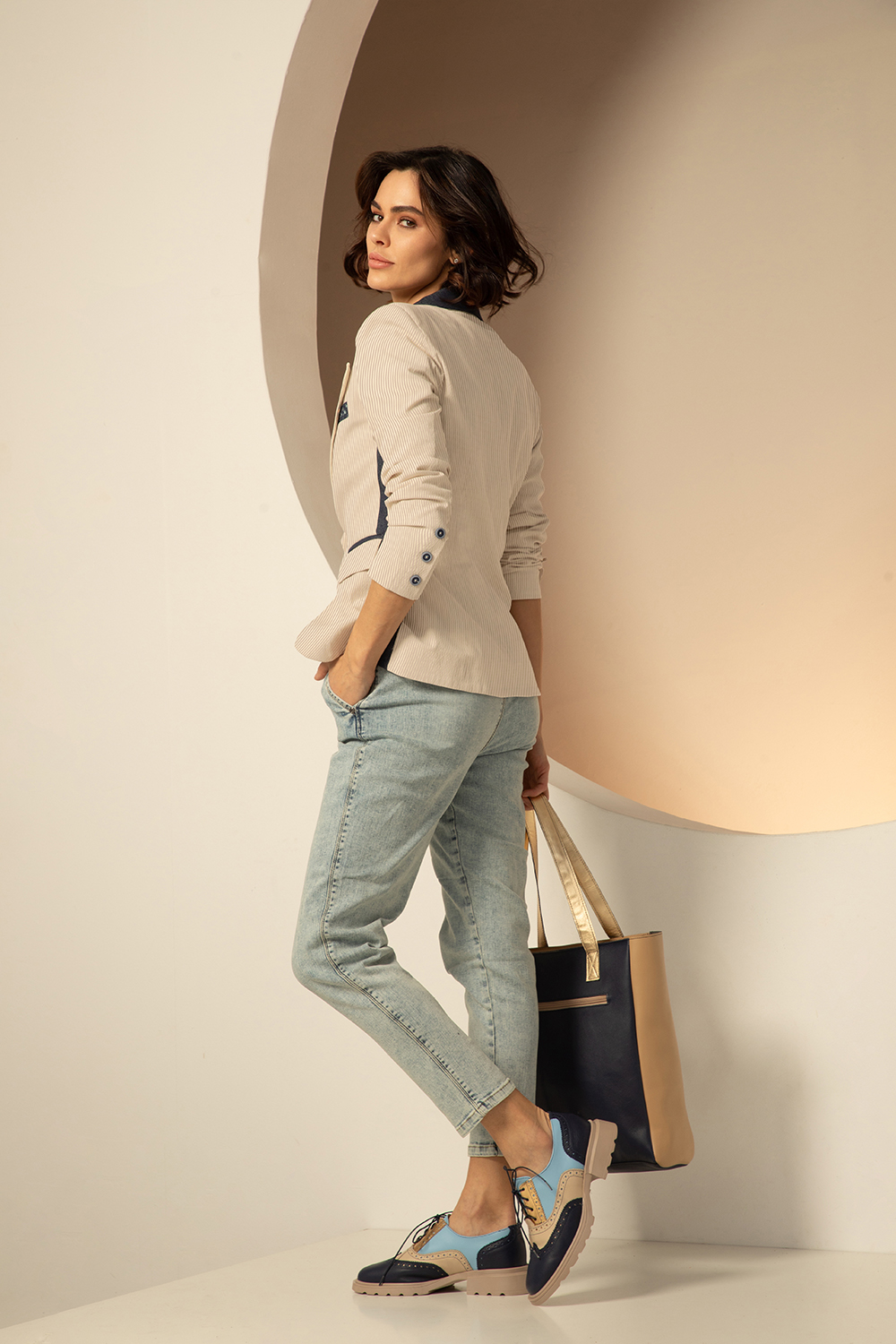 Спортно-елегантно сако в деликатно светло бежово райе с тъмносини детайли, изработено от приятна еластична материя с високо съдържание на памук. Втален силует със закопчаване с едно копче. Ефектен ревер и дълъг ръкав, предни джобове с капаци. Сакото е подплатено.