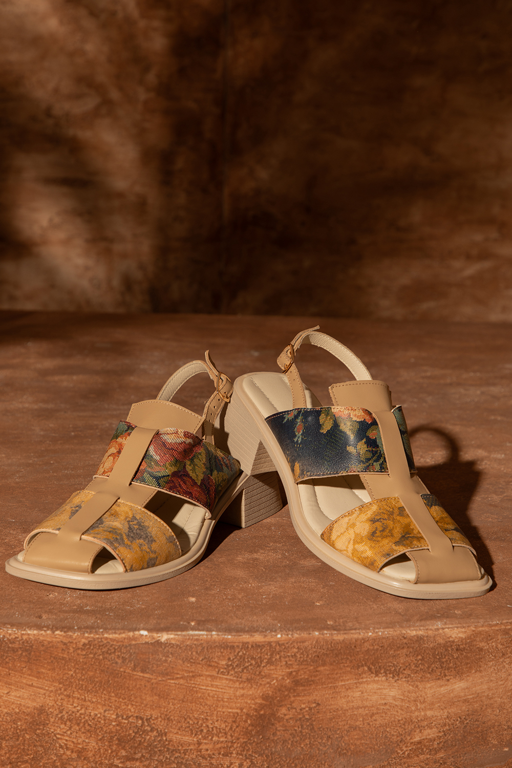 Елегантни и стилни сандали в бежово с цветни елементи. Комфортна подметка с ниско токче и закопчаване посредством тока.
