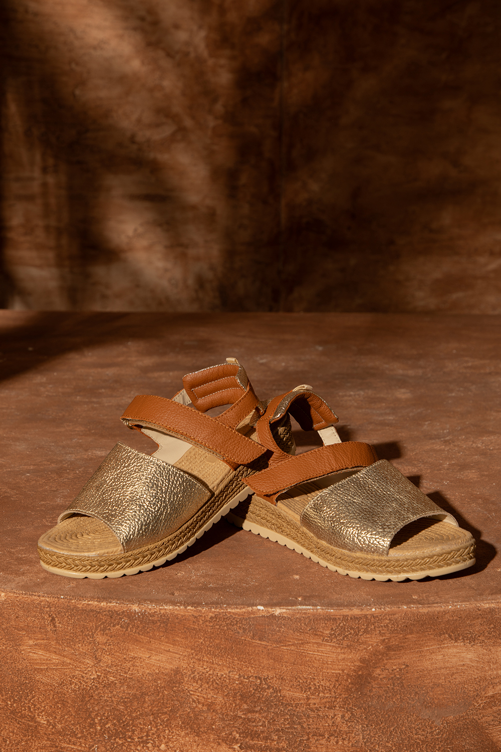 Спортно-елегантни сандали в златисто комбинирано с цвят коняк. Леки и удобни, с меко ходило и малка възглавничка на петата. Закопчаване посредством велкро.