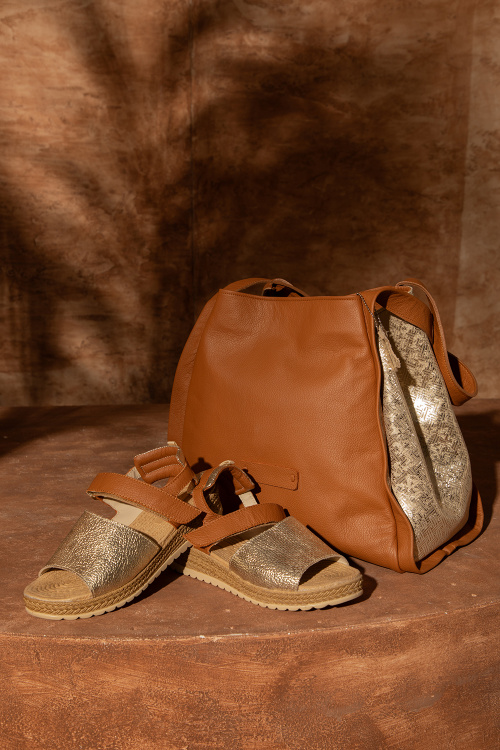 Спортно-елегантни сандали в златисто комбинирано с цвят коняк. Леки и удобни, с меко ходило и малка възглавничка на петата. Закопчаване посредством велкро.