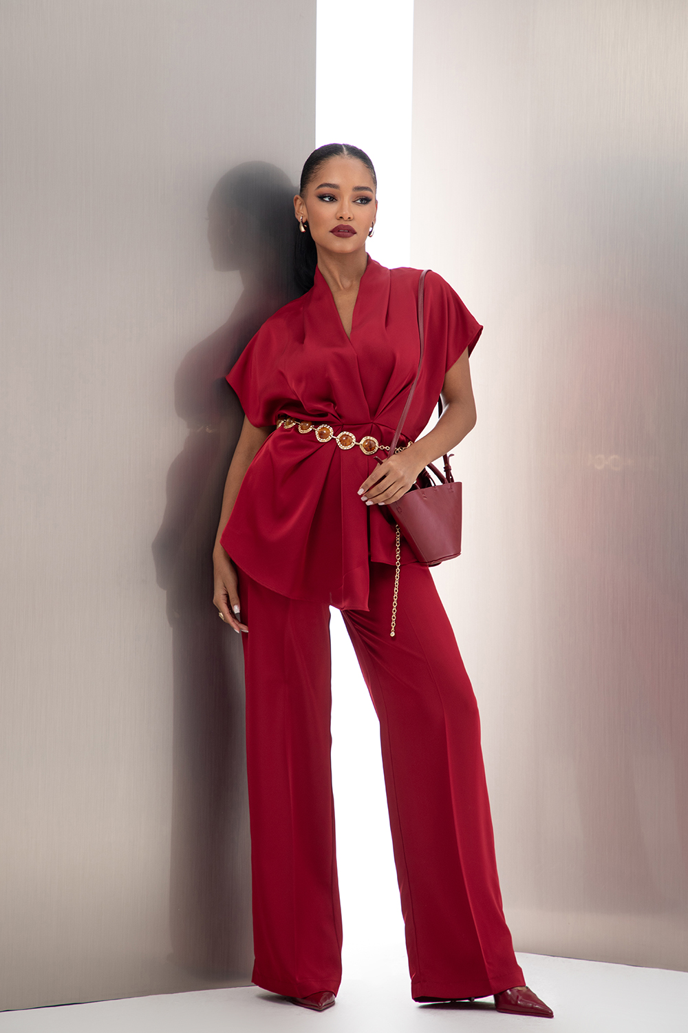 Елегантен сет от две части, изработен от приятна сатенирана материя в бордо. Блузата е с издължена линия и леко втален силует с асиметрично прехвърляне, чупки и ластик в задната част на талията. V-образно деколте и паднал къс ръкав. Панталона също е със свободна кройка, колан ластик в талията и странични джобове.