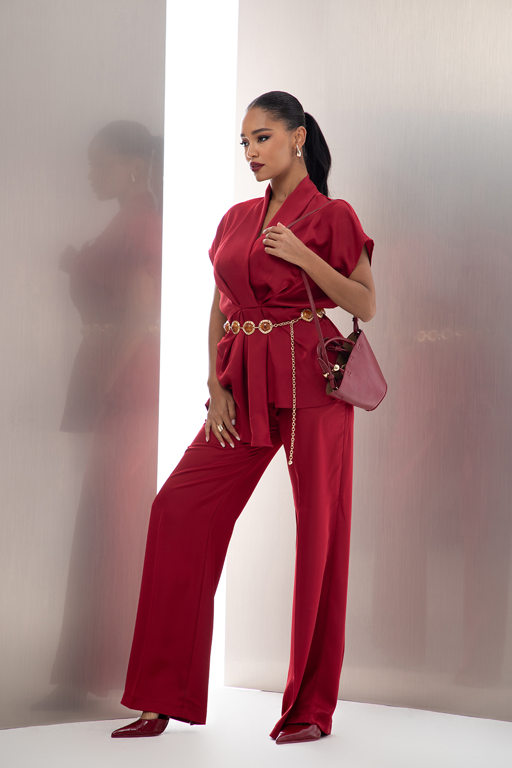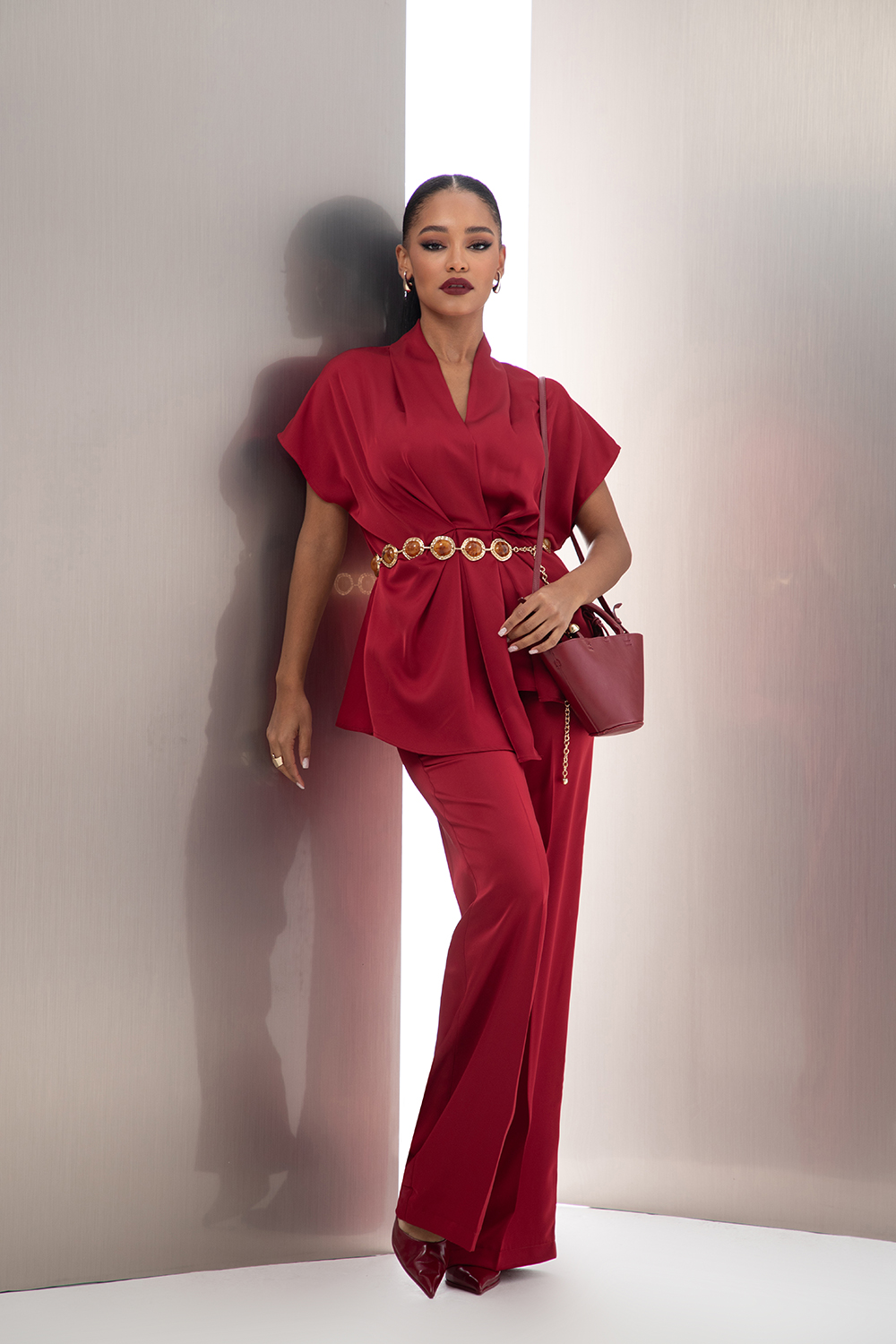 Елегантен сет от две части, изработен от приятна сатенирана материя в бордо. Блузата е с издължена линия и леко втален силует с асиметрично прехвърляне, чупки и ластик в задната част на талията. V-образно деколте и паднал къс ръкав. Панталона също е със свободна кройка, колан ластик в талията и странични джобове.