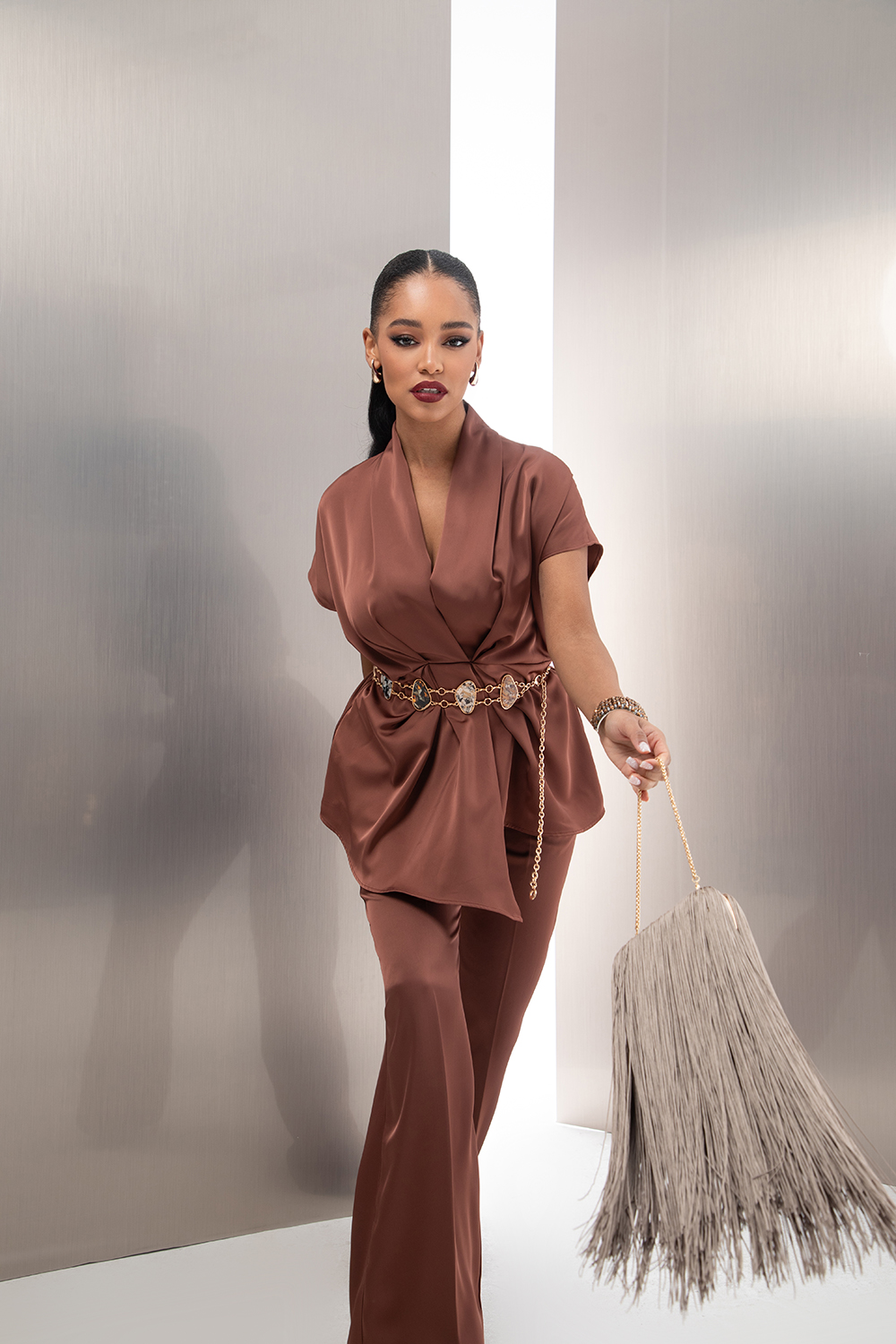 Елегантен сет от две части, изработен от приятна сатенирана материя в шоко цвят. Блузата е с издължена линия и леко втален силует с асиметрично прехвърляне, чупки и ластик в задната част на талията. V-образно деколте и паднал къс ръкав. Панталона също е със свободна кройка, колан ластик в талията и странични джобове.