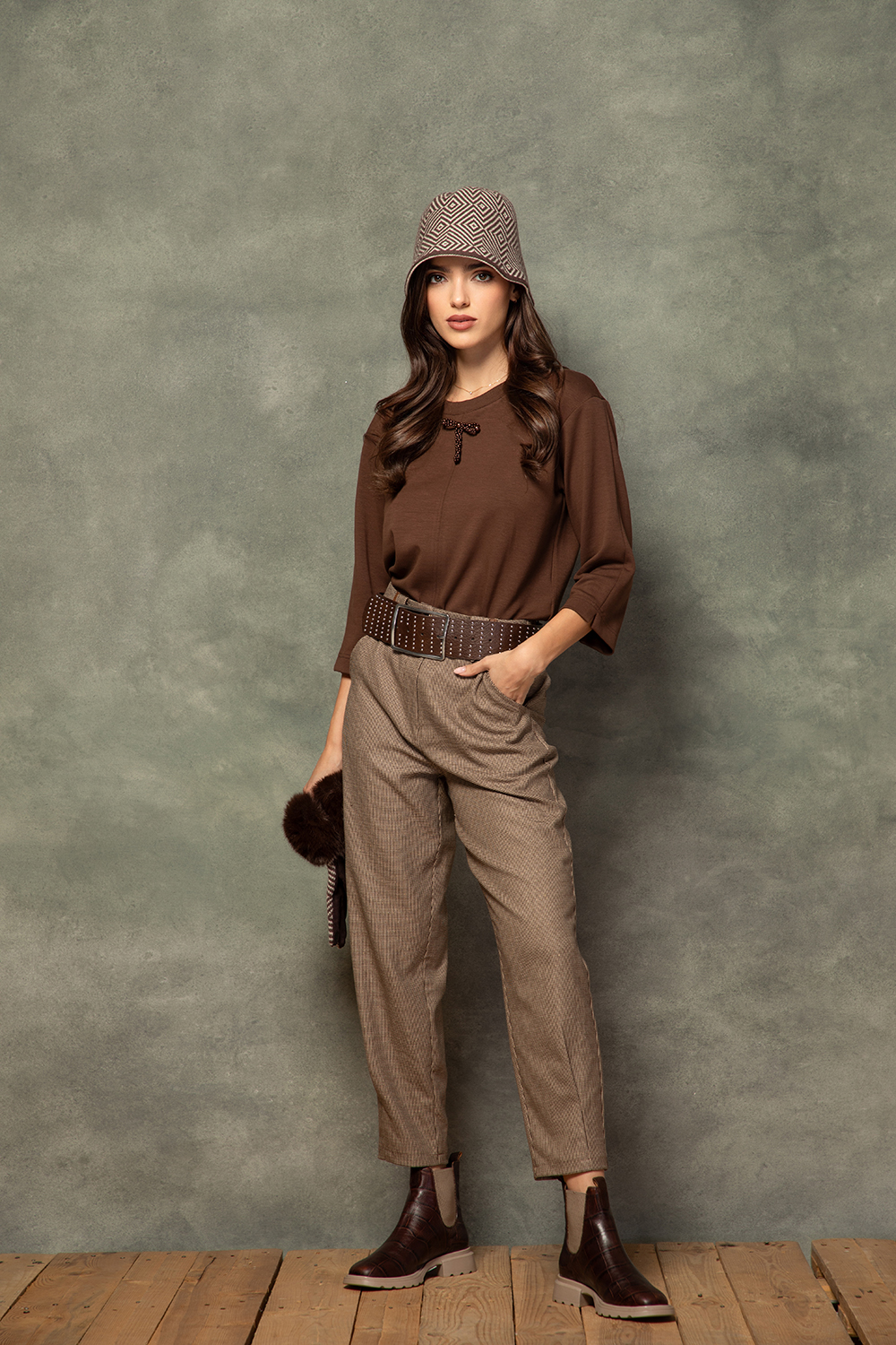 Спортно-елегантен панталон в бежово кафявата гама с десен пепит от приятна материя с високо съдържание на памук. Леко свободен силует тип балон със стеснен в долната част крачол. Ефектни гайки за колан и кожени акценти. Предни джобове и закопчаване посредством цип и копче.