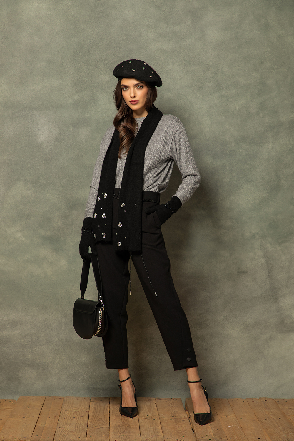 Елегантен панталон в черно от приятна еластична материя. Леко свободен силует тип балон с предно закопчаване с цип и копче. Странични джобове, декоративни филетки отзад и гайки за колан. Долната част на крачола е леко стеснена с две декоративни копчета.
