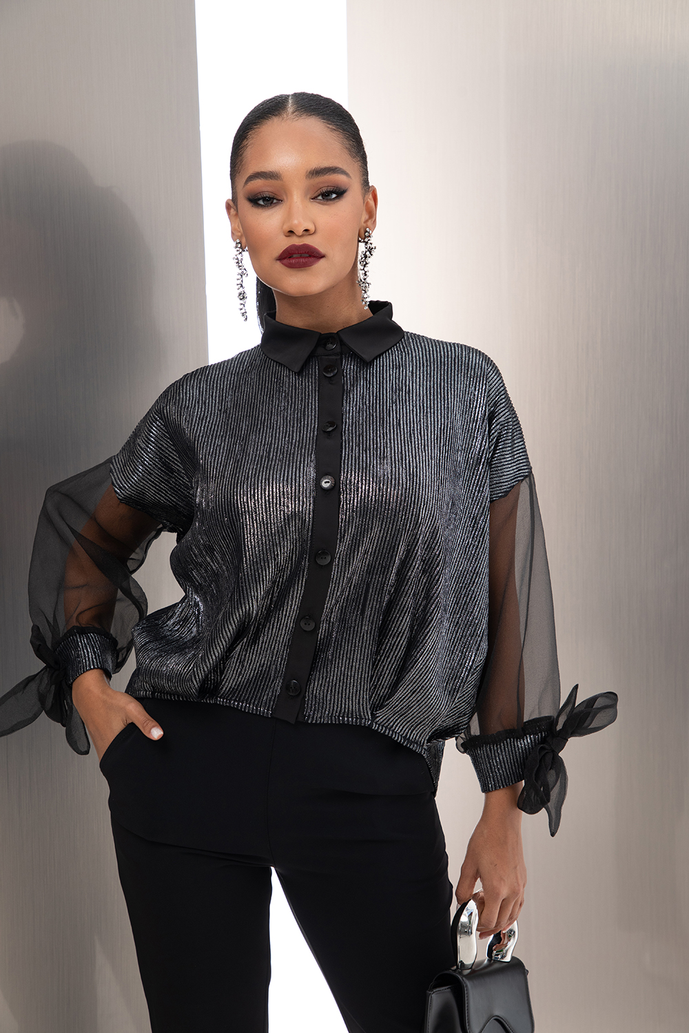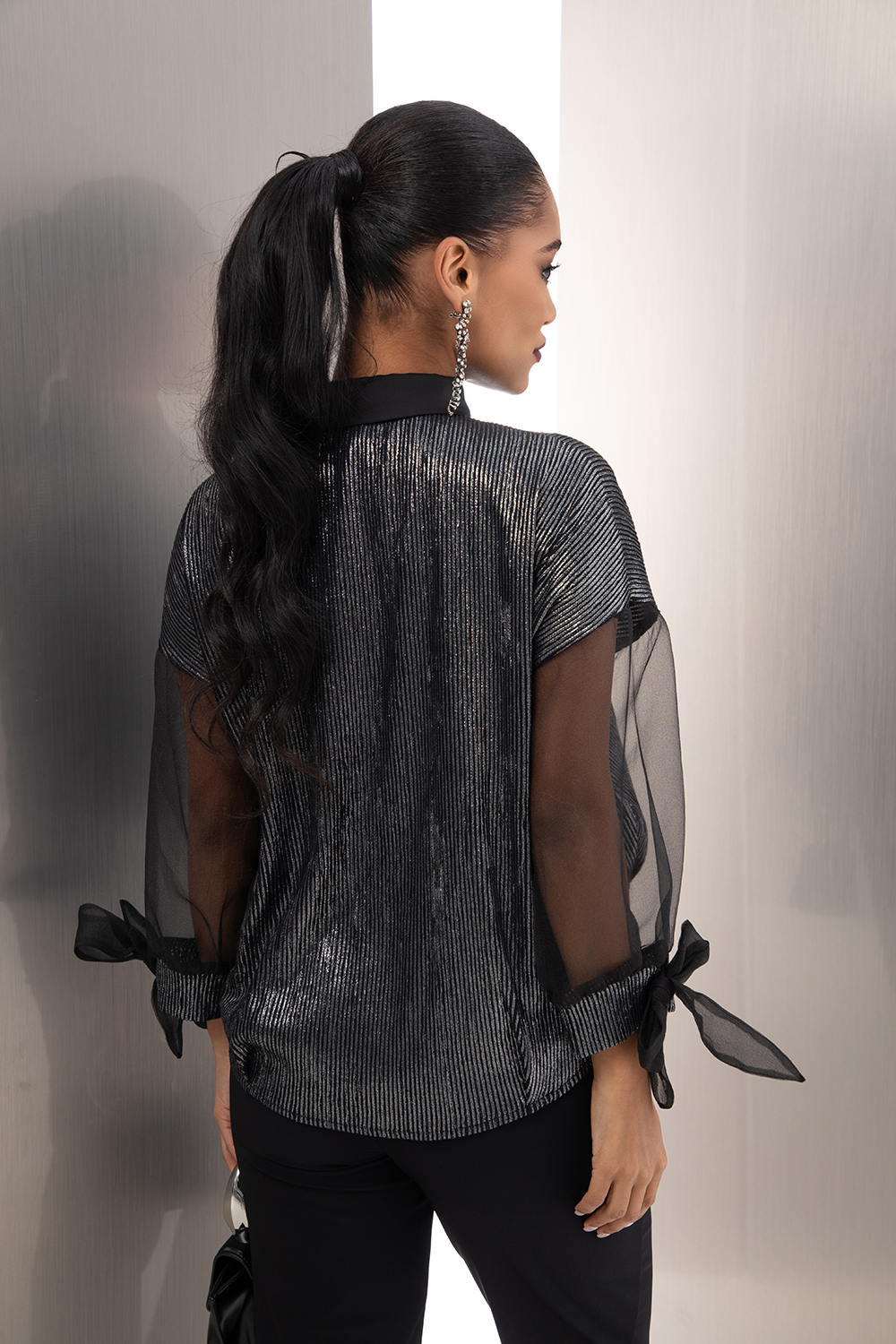 Елегантна риза в сребристо и черно от приятна еластична материя с релефен рипс. Свободен силует с чупки в предната част и издължен гръб. Закопчаване посредством пластрон с копчета и яка. 7/8 ефектен ръкав от органза с маншет и панделка.