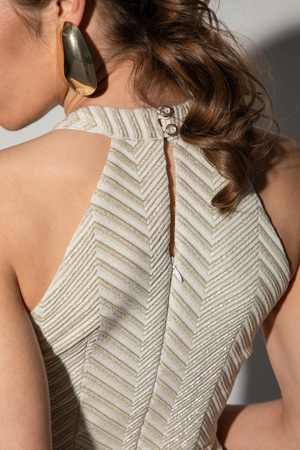 Елегантен топ от красива жакардова материя с дискретен блясък. Втален силует с обла столче яка. Закопчаване посредством цип и копчета на гърба.