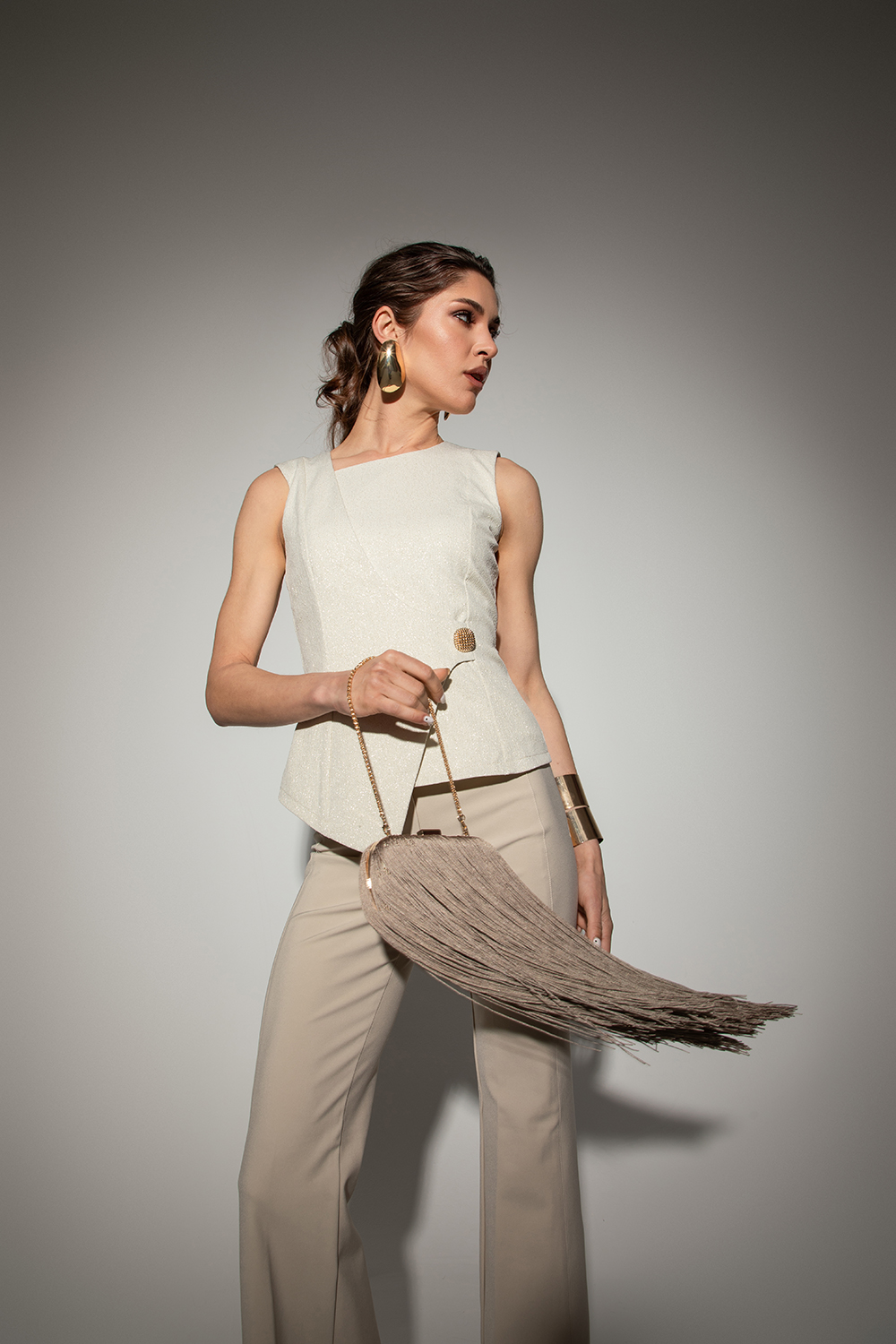 Елегантен топ от приятна материя в екрю с дискретна златиста нишка. Втален силует с овално деколте и асиметричен детайл с декоративно копче. Закопчаване посредством метален цип на гърба. Моделът е изцяло подплатен.