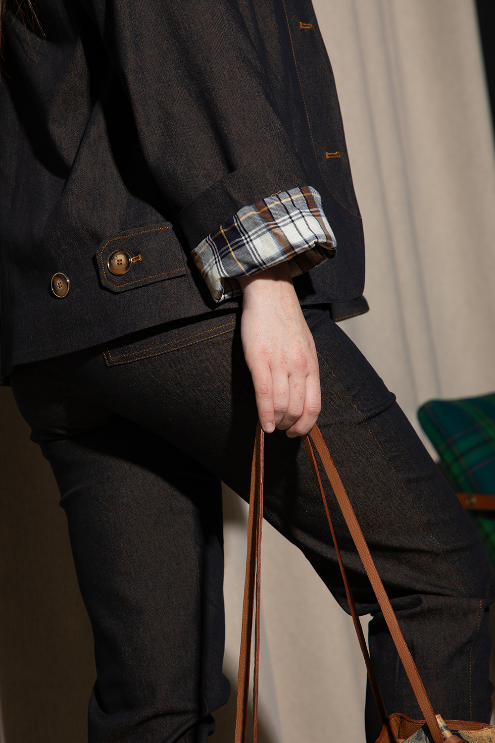 Спортно-елегатен тренчкот от еластичен памучен деним в тъмно индиго в кафяв оттенък. Леко свободен А-силует с дълъг ръкав с обърнат цветен маншет. Предно закопчаване посредством копчета и яка, два предни джоба с широка филетка. Моделът е изцяло подплатен.