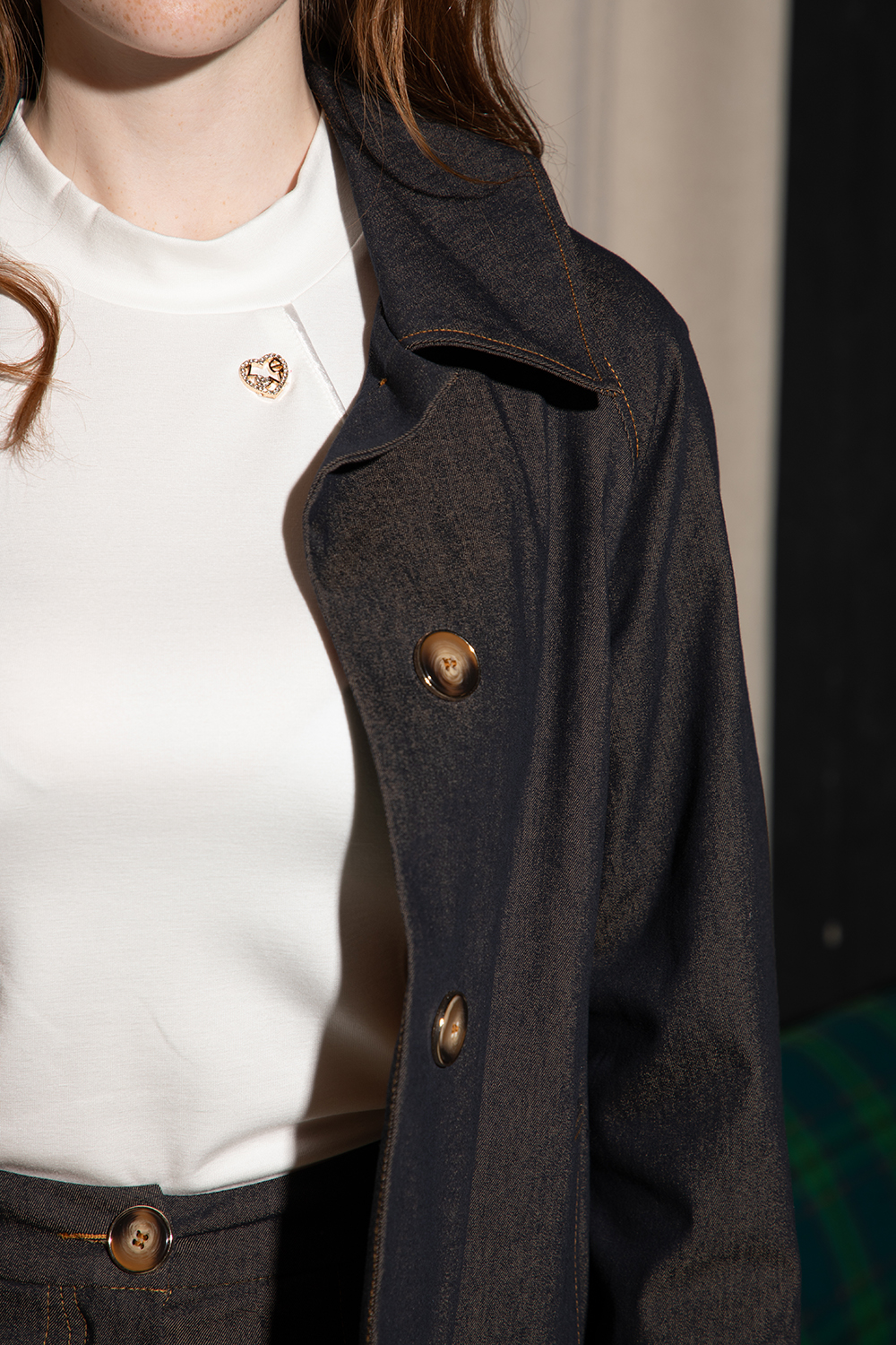 Спортно-елегатен тренчкот от еластичен памучен деним в тъмно индиго в кафяв оттенък. Леко свободен А-силует с дълъг ръкав с обърнат цветен маншет. Предно закопчаване посредством копчета и яка, два предни джоба с широка филетка. Моделът е изцяло подплатен.