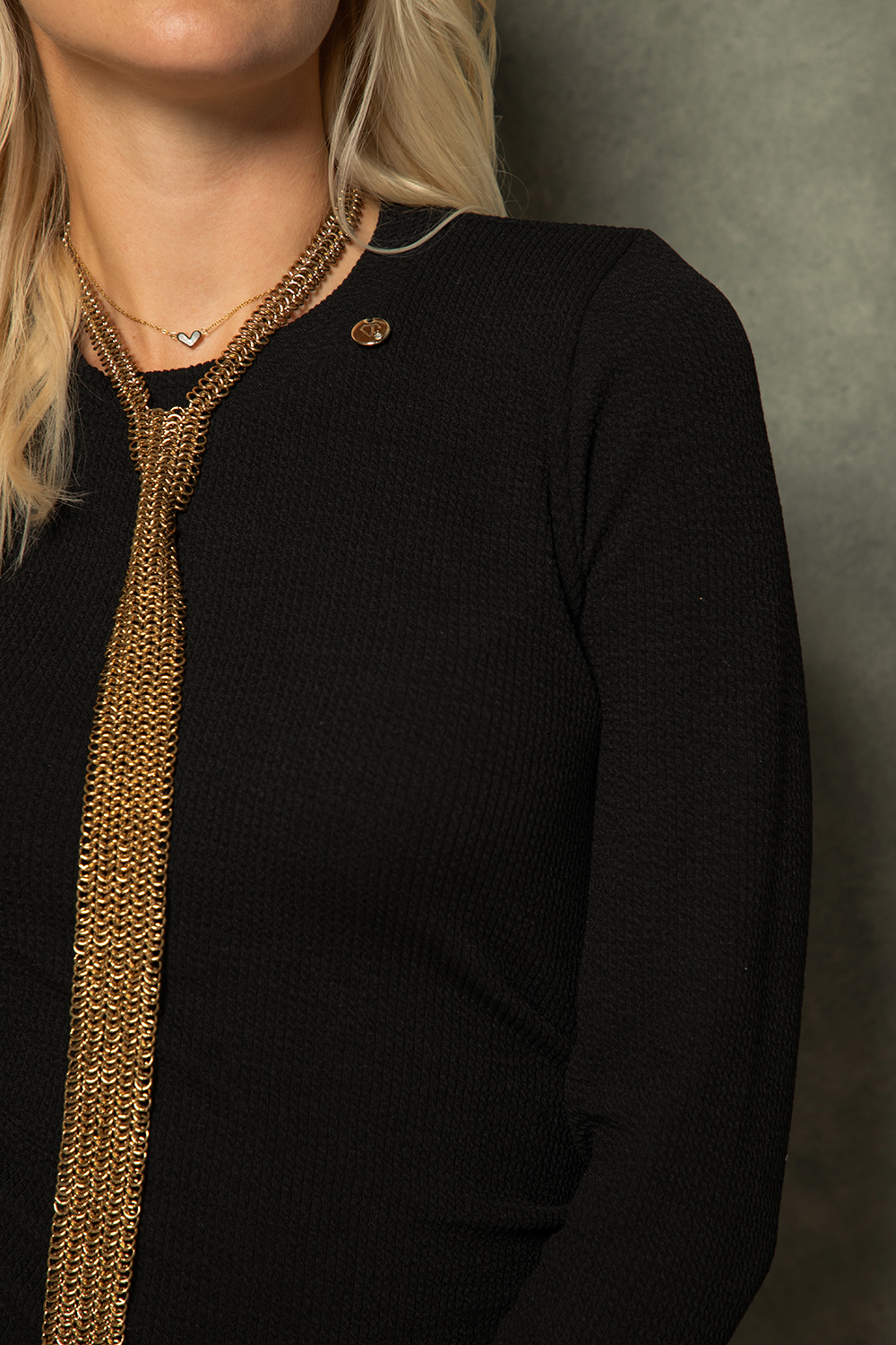Елегантна миди рокля от приятно еластично трико в черно. Силно втален силует с чупки в талията. Обло деколте и дълъг ръкав.