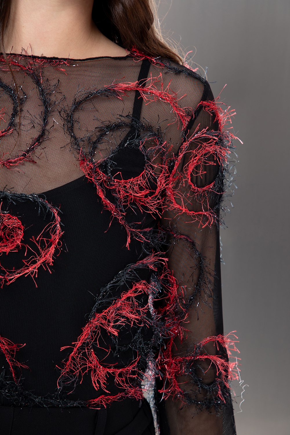 Елегантна блуза от фин черен тюл с 3Д елементи в червено. Втален силует с овално деколте и дълъг ръкав. Моделът се предлага с отделна подплата от еластична материя.