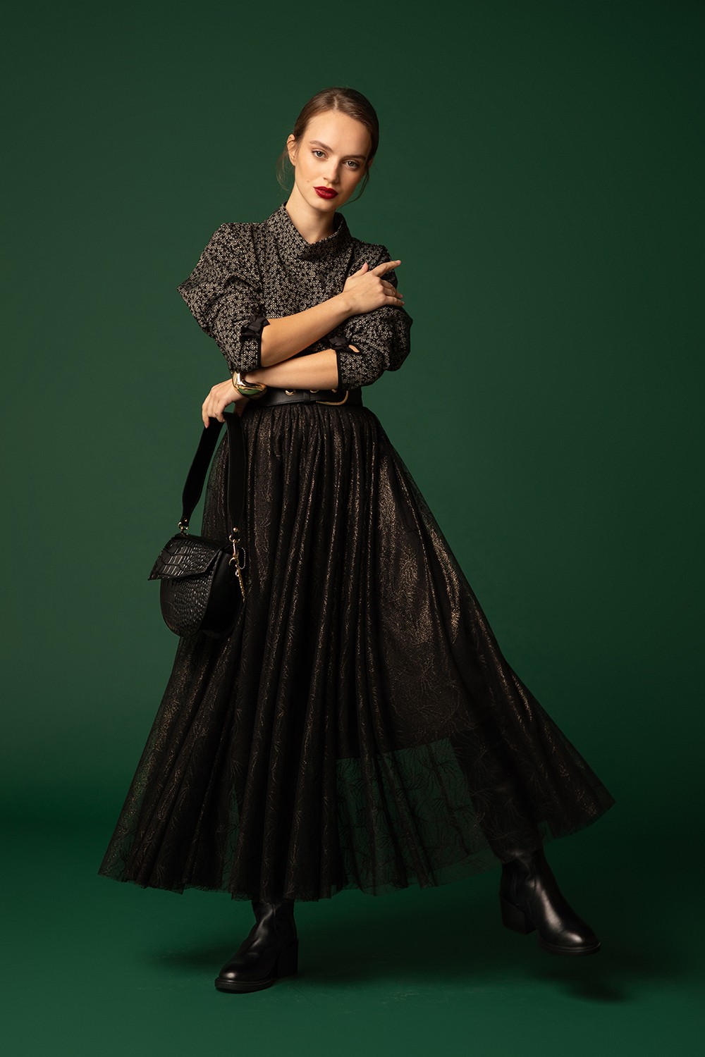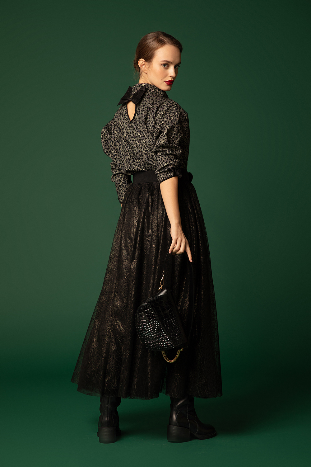 Ефектна пола от нежен черен тюл с мокър ефект и подплата в черно. Колан ластик в талията.