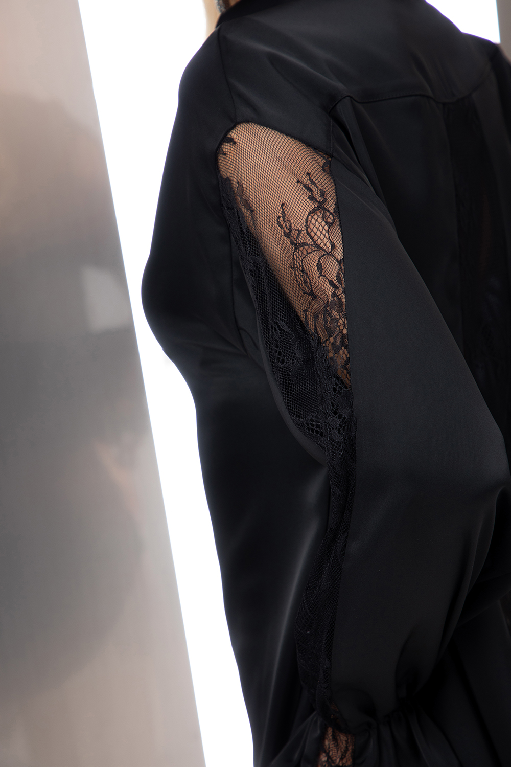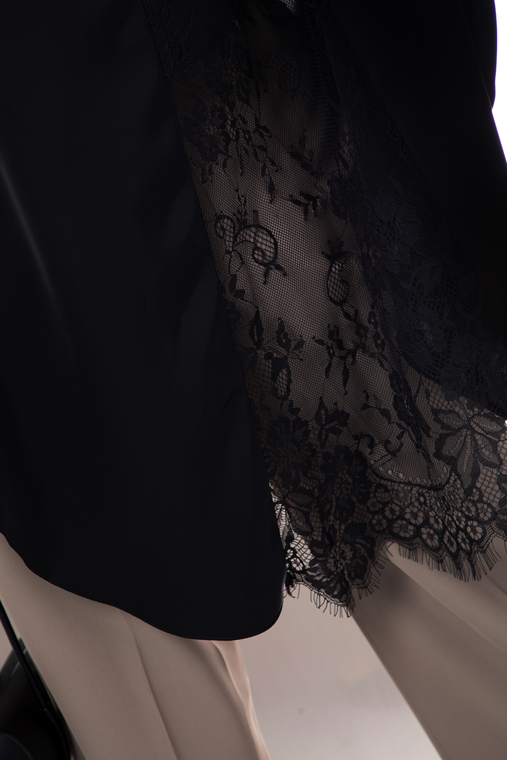 Елегантан риза от приятна сатенирана материя в черно. Свободен силует с разкроена долна част. Ефектен издължен гръб с дантелена платка. Дълъг ръкав също комбиниран с дантела. Предно закопчаване посредством пластрон с копчета.