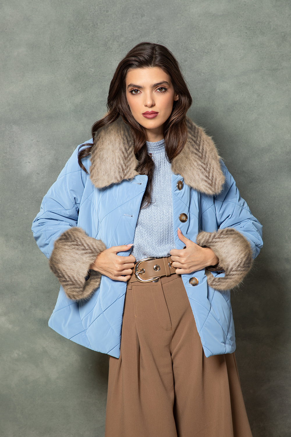 Елегантно ватирано яке в небесно синьо в комбинация с яка и маншети от еко косъм. Леко втален силует с предно закопчаване посредством копчета и джобове. Моделът е изработен от промазана и ватирана матова материя и лека подплата.