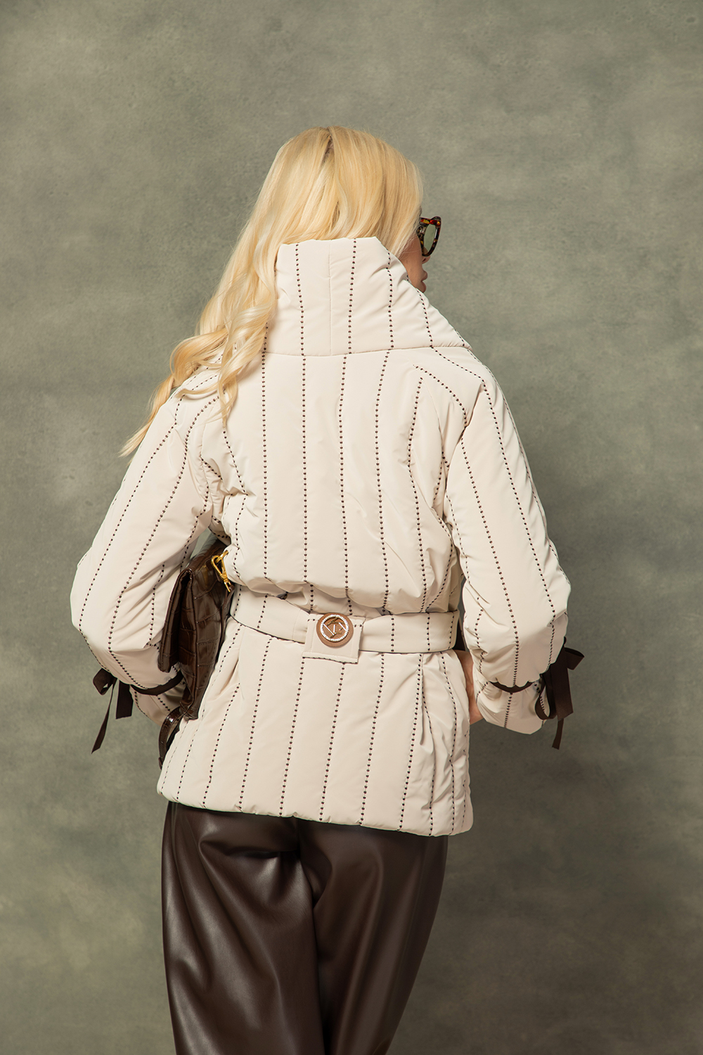 Елегантно ватирано яке в екрю с акценти в кафяво. Втален силует с шал яка и предно закопчаване посредством две копчета. Предни дбобове и подвижен колан. Ръкавите са декорирани с ластик и панделка в кафяво. Якето е изработено с подплата.