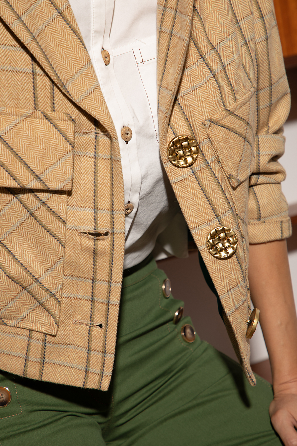 Спортно-елегантно яке от приятна материя смес от вискоза и вълна в каре цвят капучино. Свободен леко скъсен силует с големи външни джобове и капаци. Предно закопчаване посредством копчета и ревер. Якето е изработено с нежна сатенирана подплата.