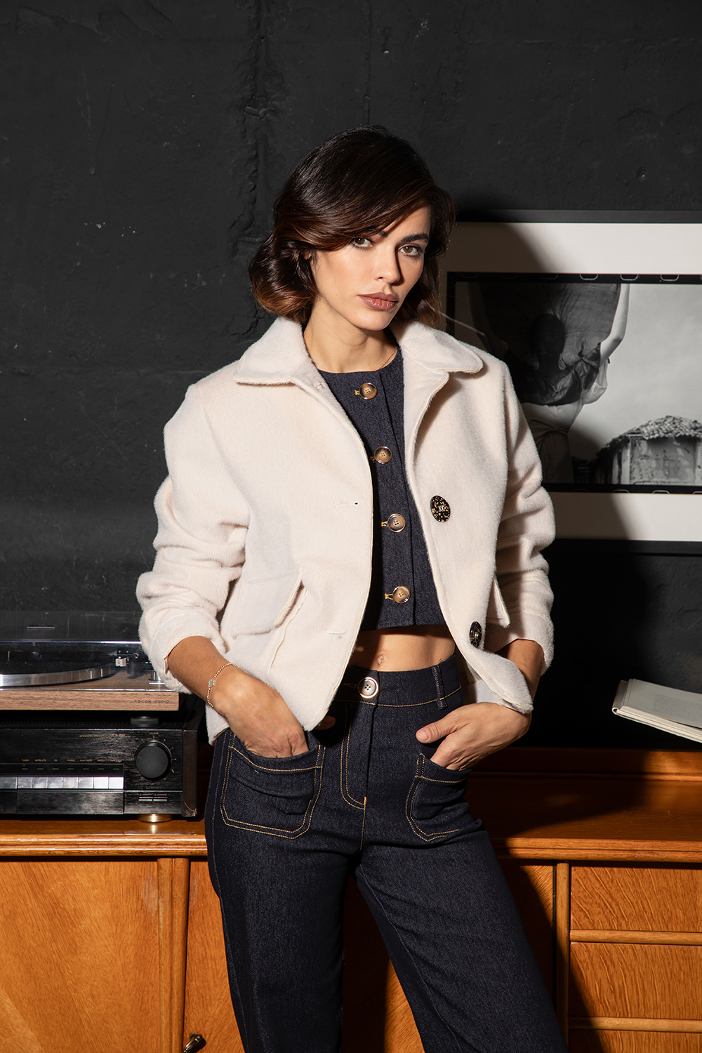 Елегантно преходно яке от ефектна материя с къс косъм в цвят светло шампанско. Свободен, леко скъсен силует с големи външни джобове с капаци. Предно закопчаване посредством две копчета и яка.