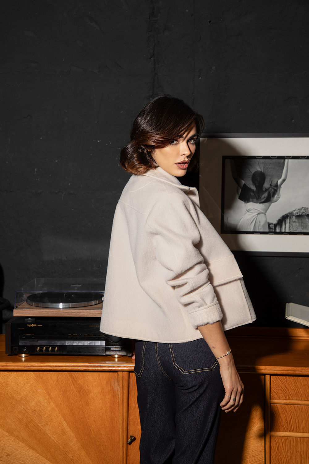 Елегантно преходно яке от ефектна материя с къс косъм в цвят светло шампанско. Свободен, леко скъсен силует с големи външни джобове с капаци. Предно закопчаване посредством две копчета и яка.