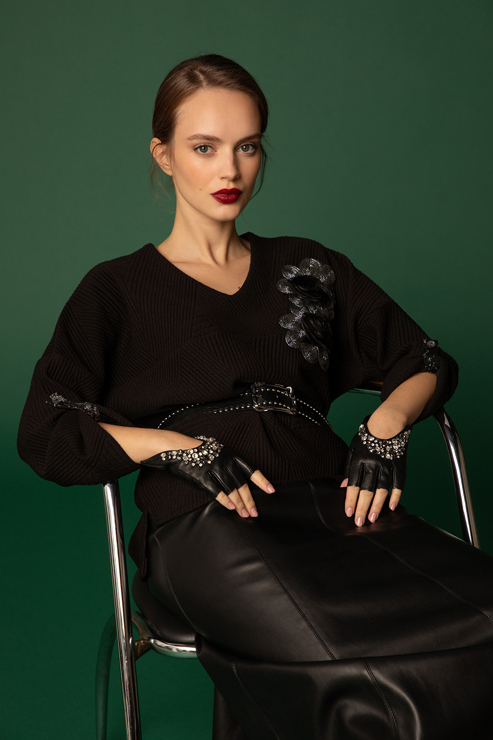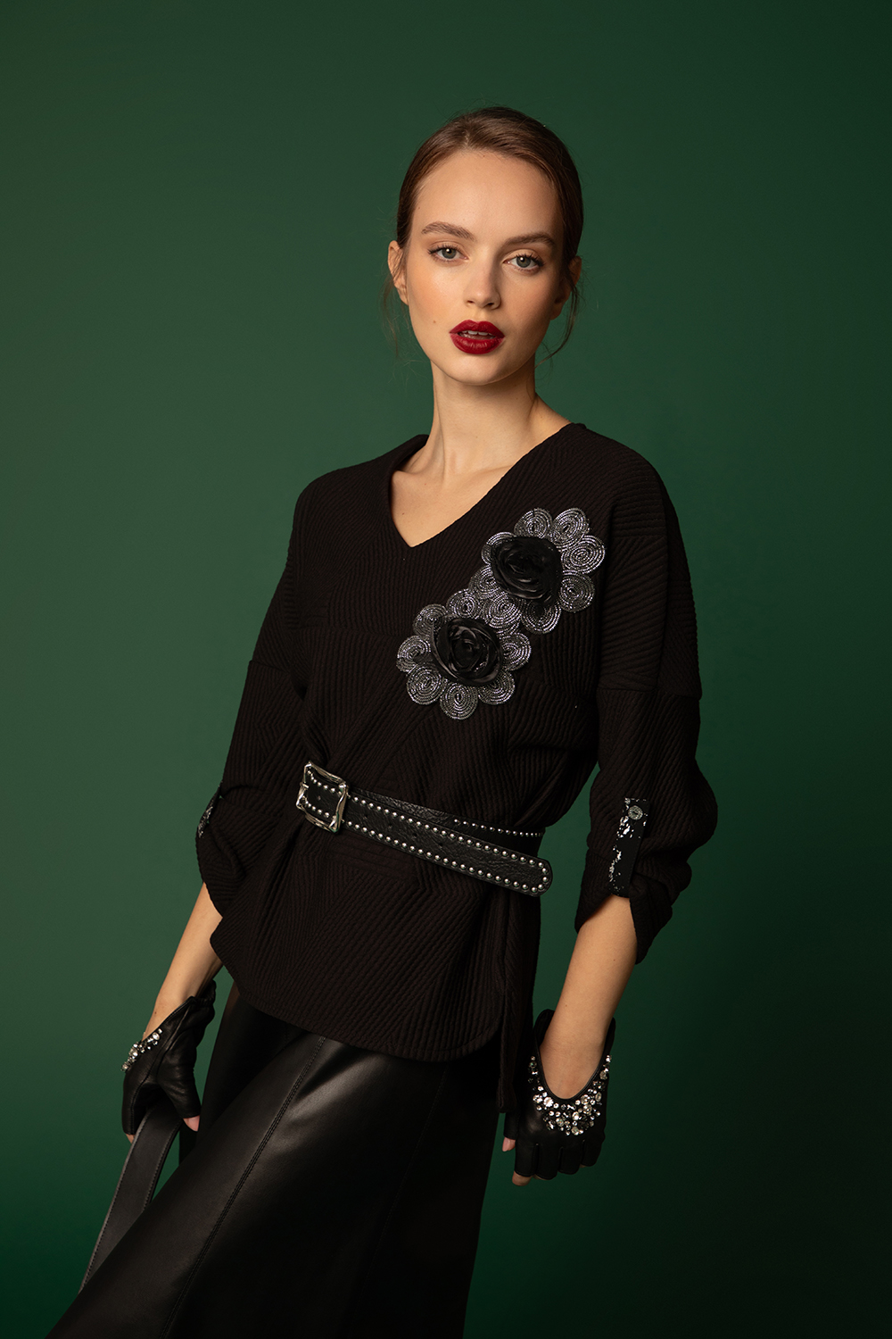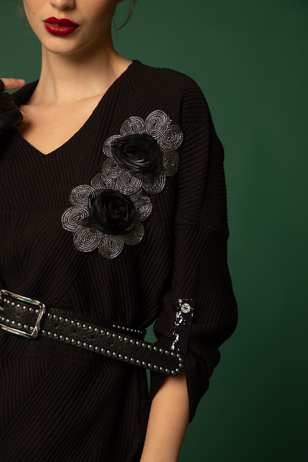 Елегантна блуза в черно от релефна жакардова материя с еластан. Леко свободен силует с издължена задна част и заоблени цепки встрани. V-образно деколте и 7/8 ръкав с щрифелка. Апликирани 3Д цветя на предницата.