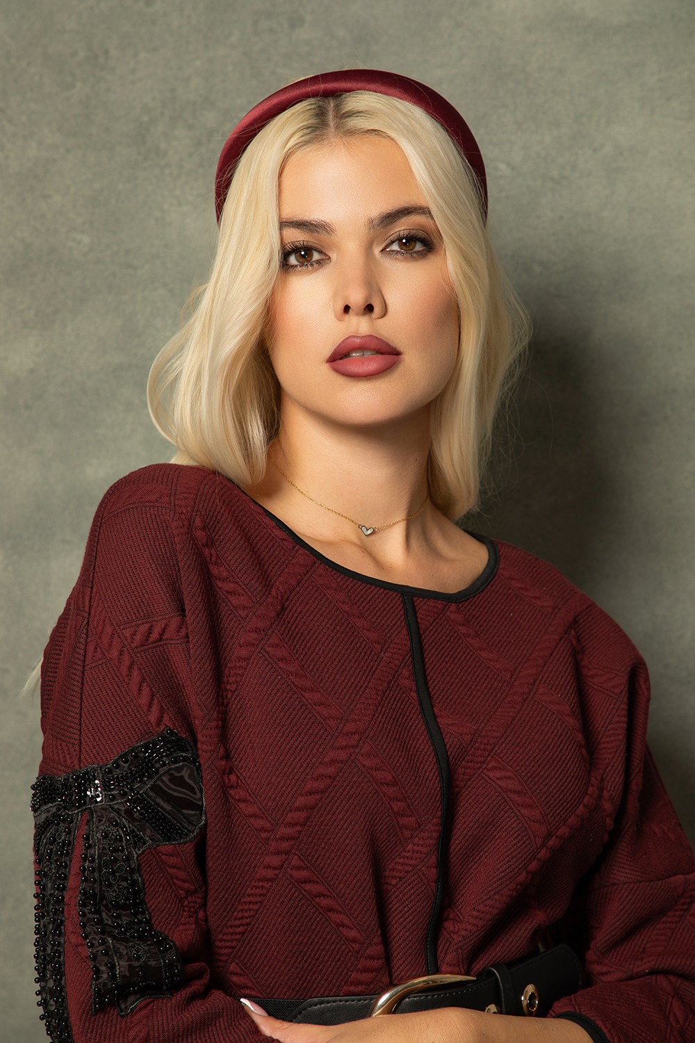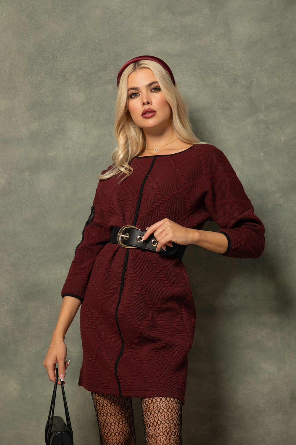 Елегантна рокля от релефна жакардова материя в бордо, комбинация с черен кант в екрю. Свободен силует със 7/8 прилеп ръкав. Обло деколте и ефектна декоративна пандела на единия ръкав.